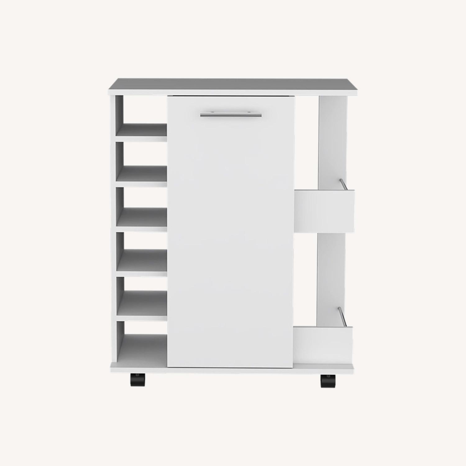 Seller's Notes:"Elevate your gatherings with the Cabot Bar Cart - where elegance meets convenience. This stylish and functional bar cart, crafted from durable manufactured wood, is available in elegant black or white finishes. Glide it effortlessly to any room with its smooth-rolling casters. The Cabot boasts six wine cubbies (4.7""H x 5.5""W) to showcase your finest bottles, while the single-door cabinet with a chic metal handle reveals hidden storage for your bar essentials. Two side shelves (14.1""H x 14.7""W) provide extra space for glassware and accessories. The generous upper surface (25.8""W x 14.7""D) is perfect for drink preparations and hors d'oeuvres. Dimensions: Height: 32,3"" Width: 25,8” Depth: 14,7“ Furniture Type: Ready to assemble (full assembly required). Certifications: CARB phase II compliant – TSCA Title VI Compliant. Warranty: 1-year warranty coverage in wooden parts- 1-year warranty coverage in hardware pieces since its manufacturing date found in the lot number printed in the product box."