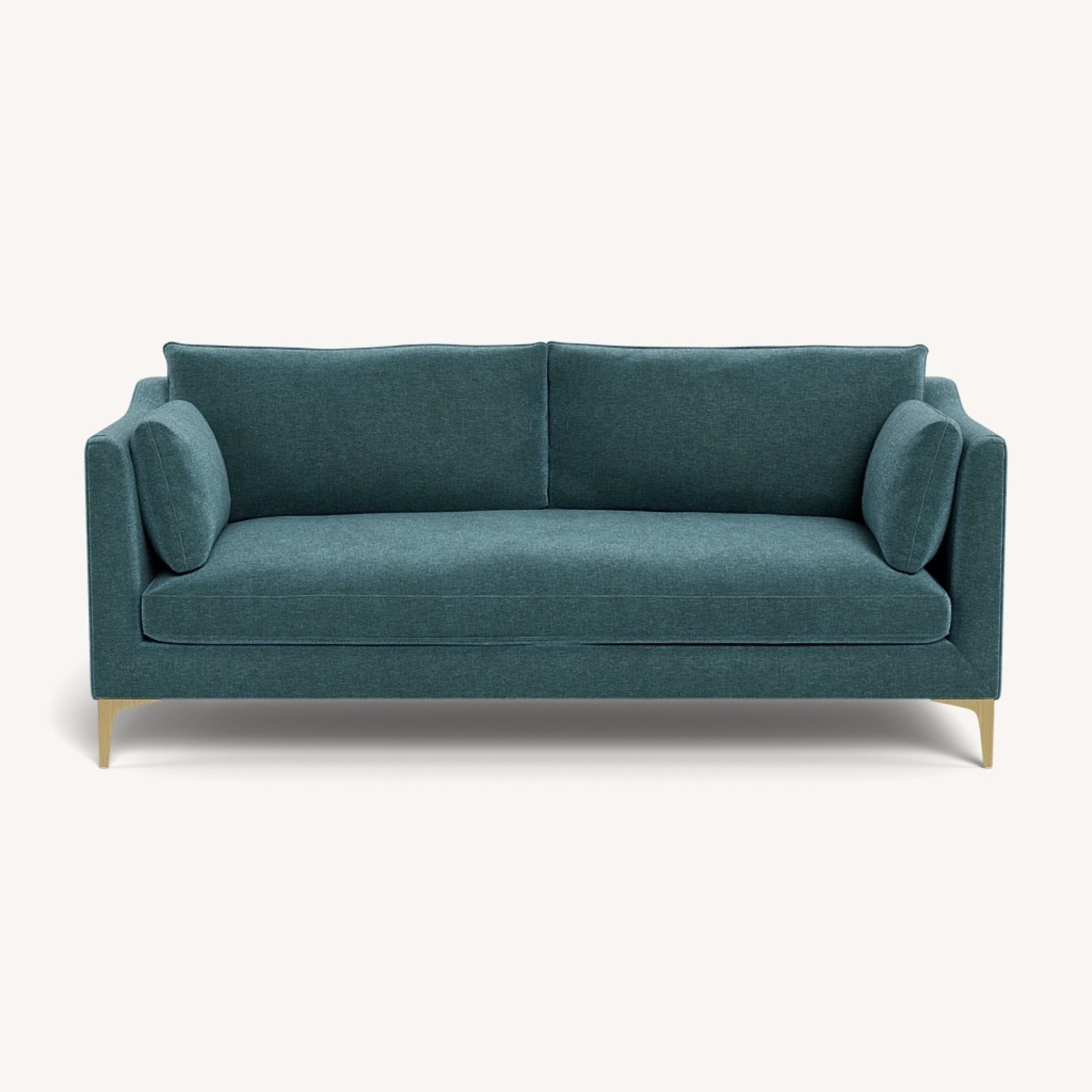 Seller's Notes:Sofa is in great condition having been kept in home office and rarely sat on. Comes with matching side pillows. Cushion fill is down alternative. Minor scratches on one leg from moving
