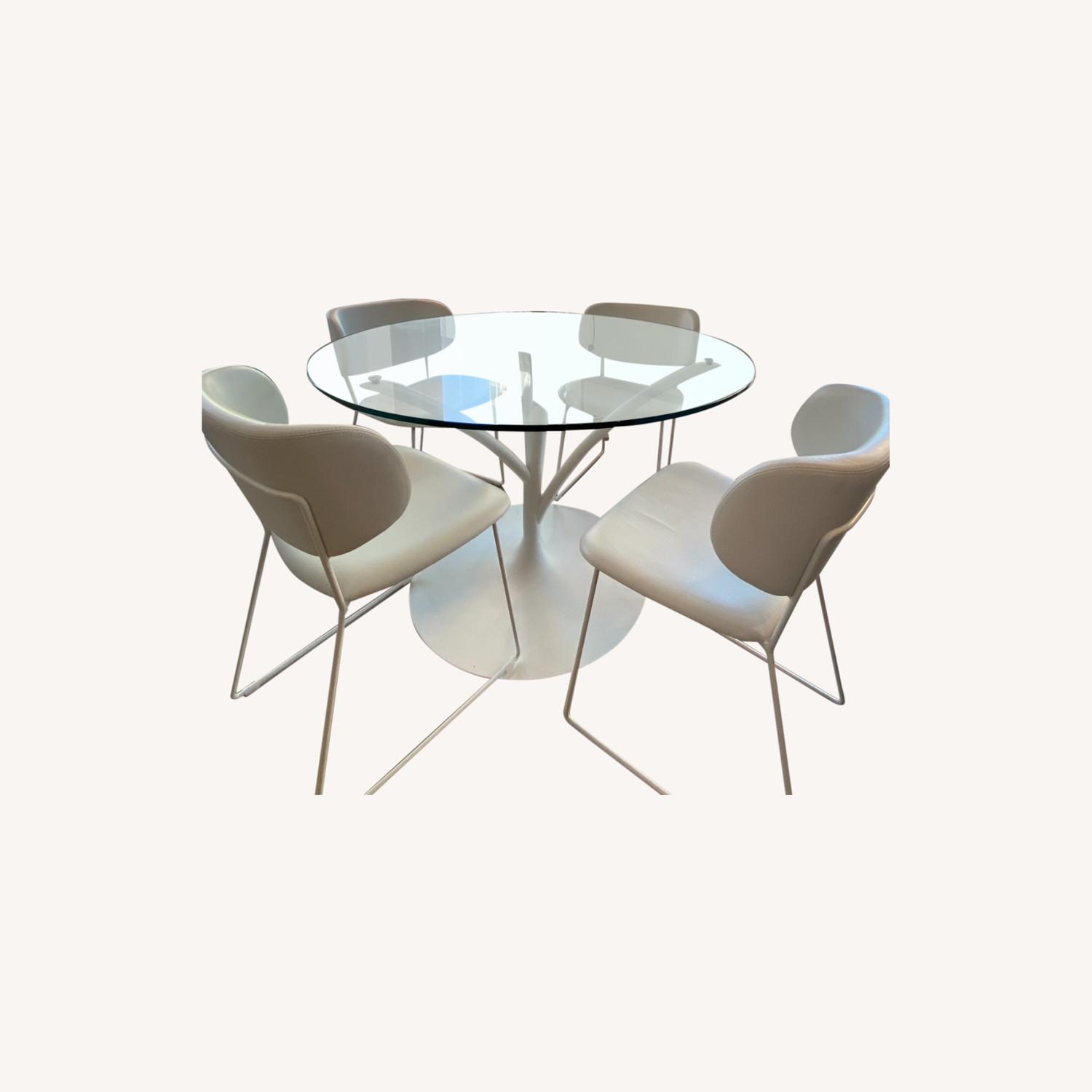 Seller's Notes:Dining Table or chairs can be bought separately. Please message for the selling prices for them individually. Tiny blemishes on the leather chairs but generally in good condition. Those blemishes could probably be wiped away. Very stylish dining table that sits comfortably in the living room. The leather is easy to maintain. Even though the chairs were white, they never stained. I love this dining set so much but have to sell them because I am moving.