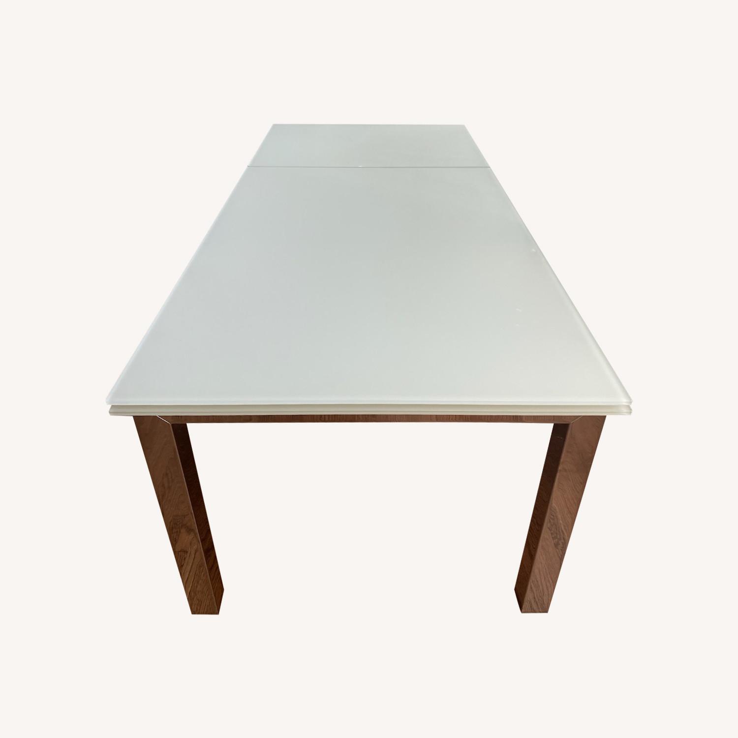 Seller's Notes:100% Italian Design Founded in 1923, Calligaris has become known for its unique combination of quality, technology and Italian Style. All products are conceived to satisfy the needs and habits of today’s life, keeping in mind the importance of a personal touch and practical solutions. Not only do Calligaris products look great, their quality goes beyond their UNI EN ISO 9001 certifications: each piece of furniture is treated with the same care and passion inherited from the handcrafting traditions of company founder Antonio Calligaris. Committed to the responsible management of raw material, waste recycling, pollution, consumption and scrap reduction; Calligaris is focused on promoting a balanced relationship between the use and replenishment of natural resources. W 51.25″-77″-102.5″ x D 35.5″ x H 30″ Features: • Tempered glass top available in white finish. • Sturdy steel legs in chrome. • Table easily extends to three different lengths. • High quality construction, 100% Italian made.