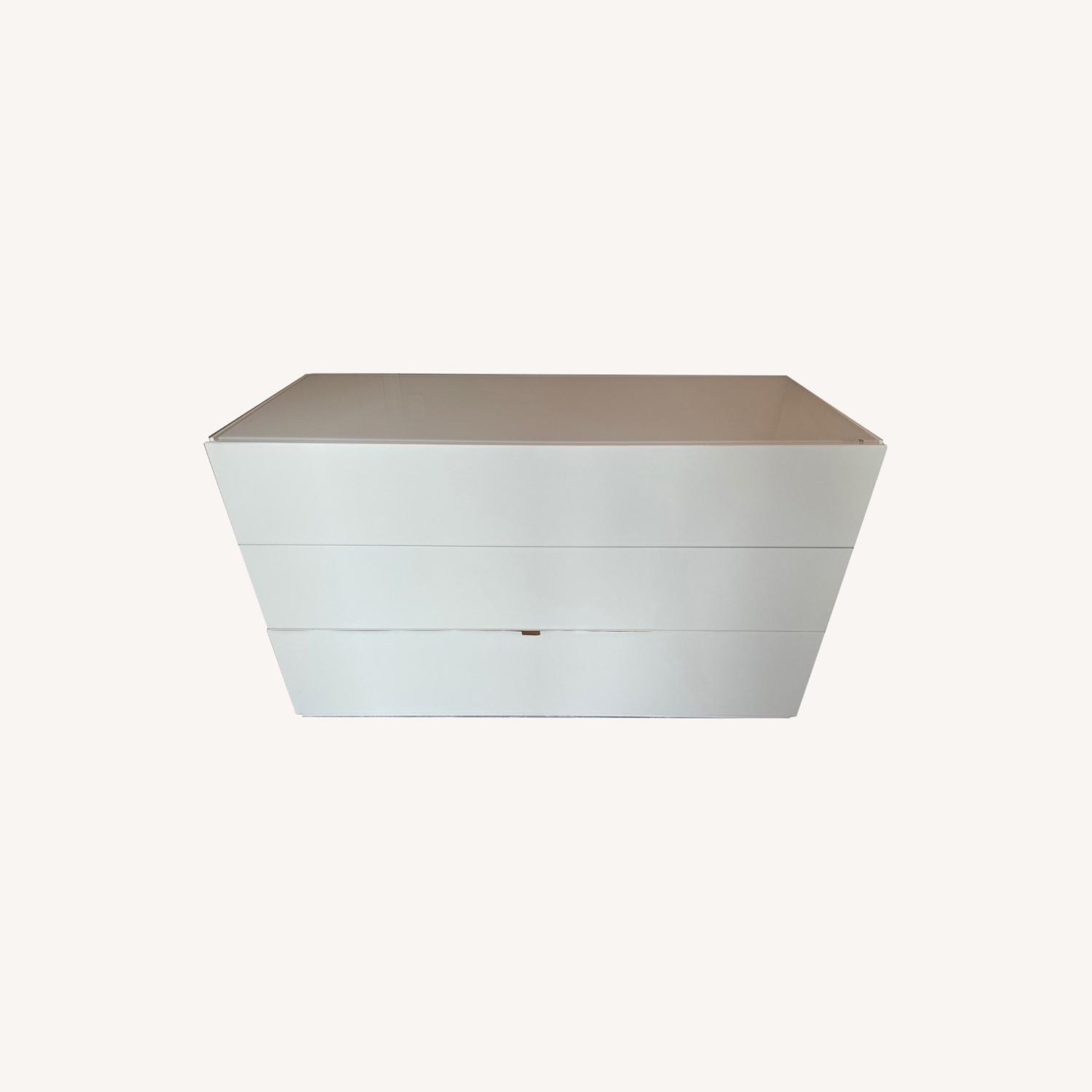 Seller's Notes:The City dresser has a clean and elegant design and is characterized by a tempered glass top. The drawers have matching inner light wood and the handless drawers offer soft closing. The bottom drawer covering (note: just the covering, not anything affecting the function of the drawer) is a bit damaged but could be repaired and the dresser could look good as new. Aside from the aesthetic damage to the bottom drawer covering, the dresser is in great condition and functions beautifully.
