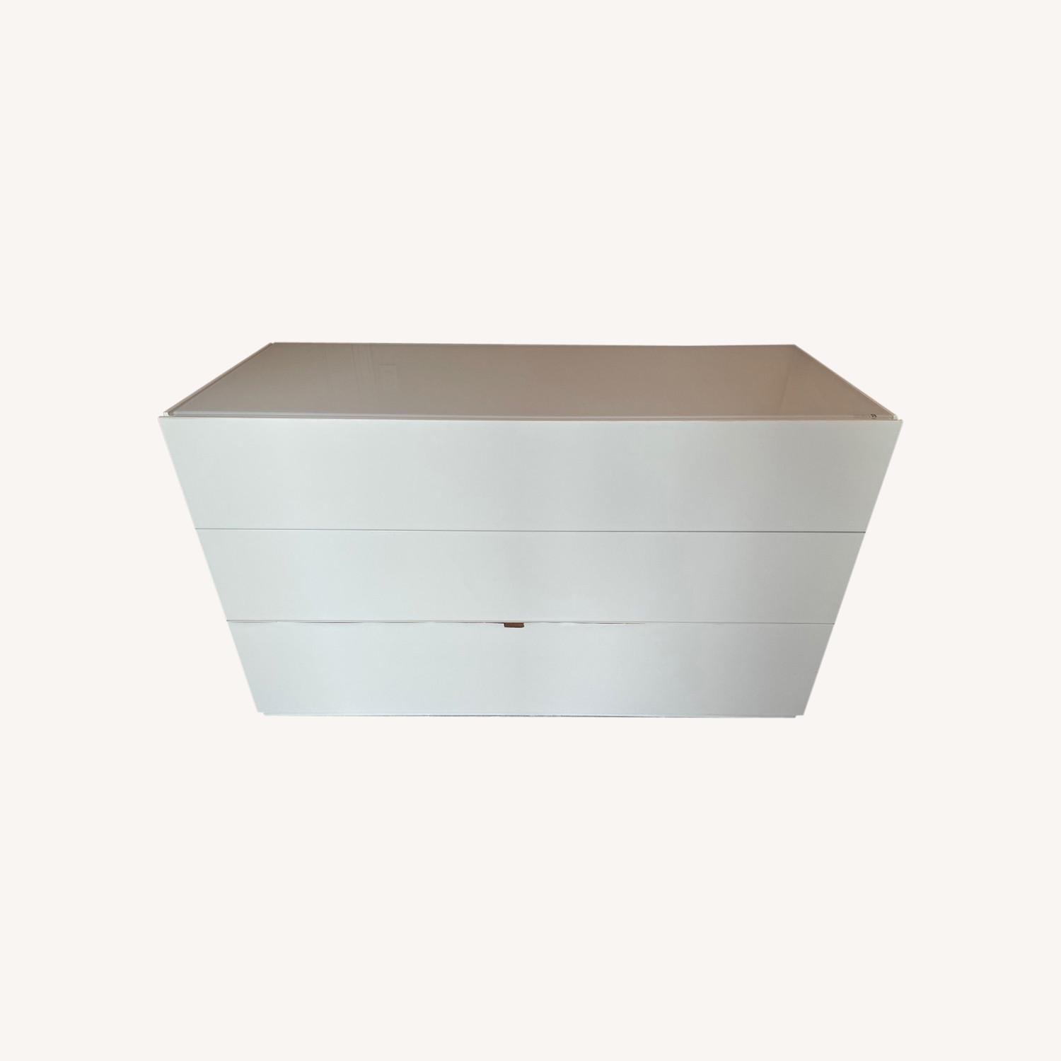 Seller's Notes:The City dresser has a clean and elegant design and is characterized by a tempered glass top. The drawers have matching inner light wood and the handless drawers offer soft closing. The bottom drawer covering (note: just the covering, not anything affecting the function of the drawer) is a bit damaged but could be repaired and the dresser could look good as new. Aside from the aesthetic damage to the bottom drawer covering, the dresser is in great condition and functions beautifully.