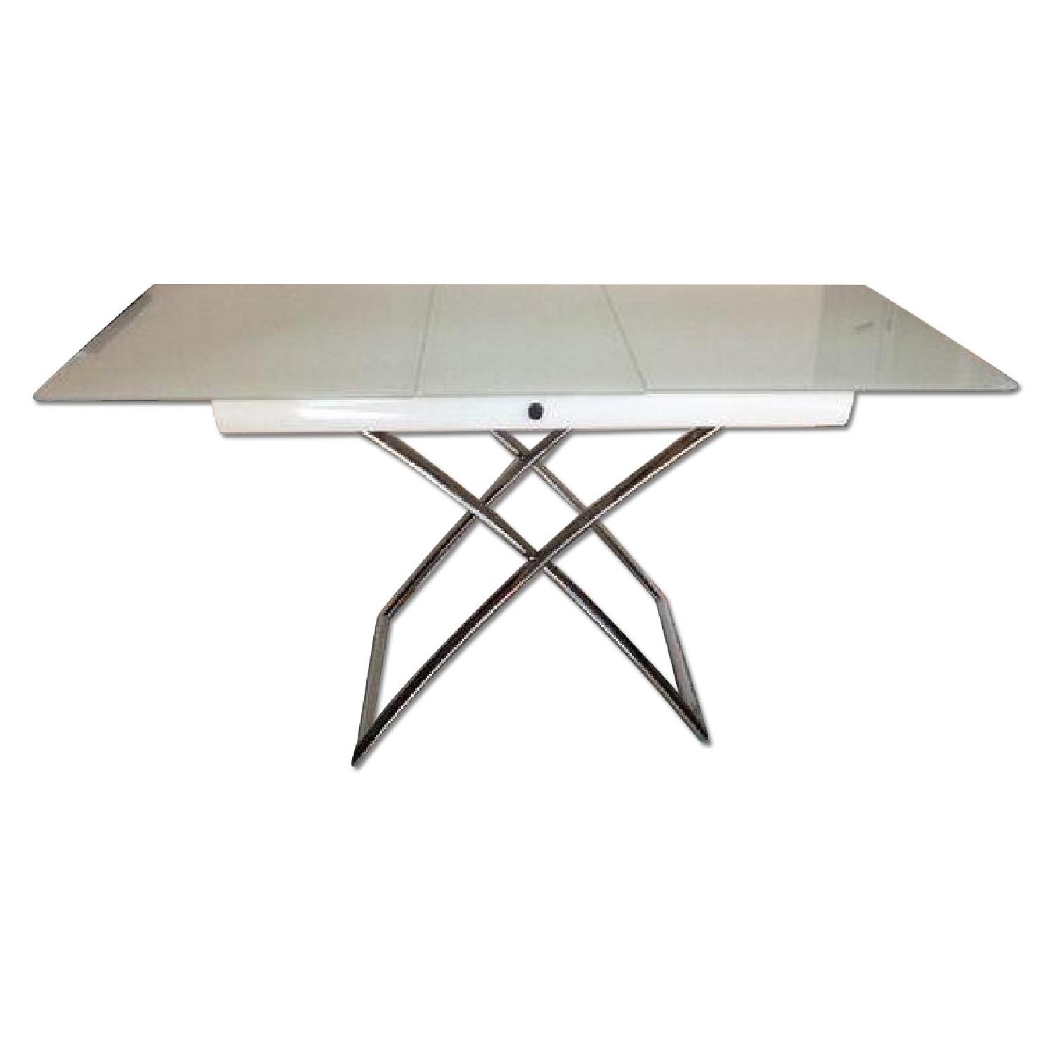 Seller's Notes:The Dakota Dining/Coffee Table is a versatile coffee table that is ideal for studio flats or living rooms. In a few seconds it becomes a dining table: just press the button on the metal underframe to adjust it to one of the 7 heights available (from 17.5'H to 29.5'H). The 2 side extension leaves stored inside the underframe slide out from 44.5'W to 73.5'W glass top. Made in Italy.