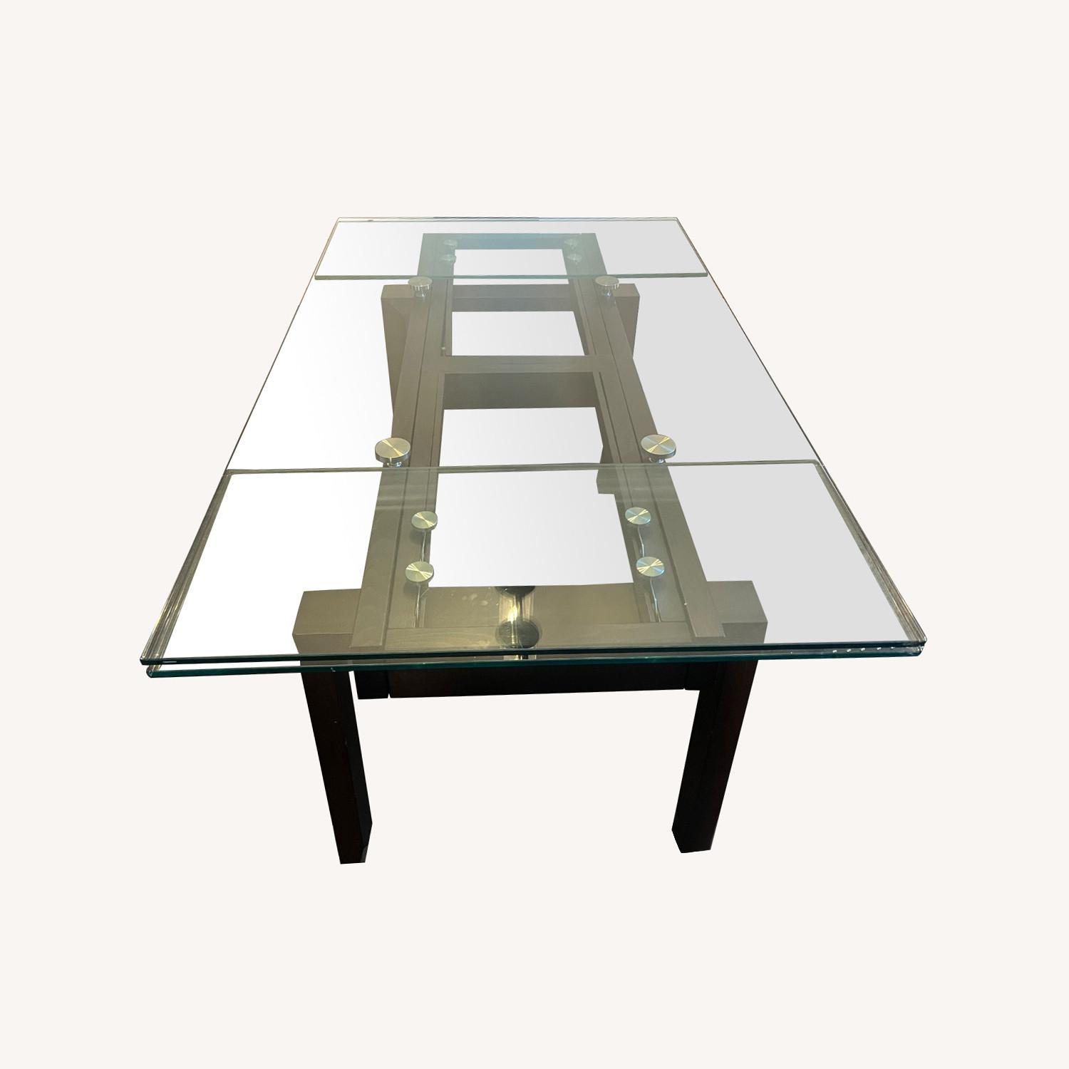 Seller's Notes:This is a glass table with two extendable leaves built into the sides of the table. The table is 63 in without the extension. With both leaves extended it’s 94 in. The table can hold 6 without extension or 8-10 with extension.