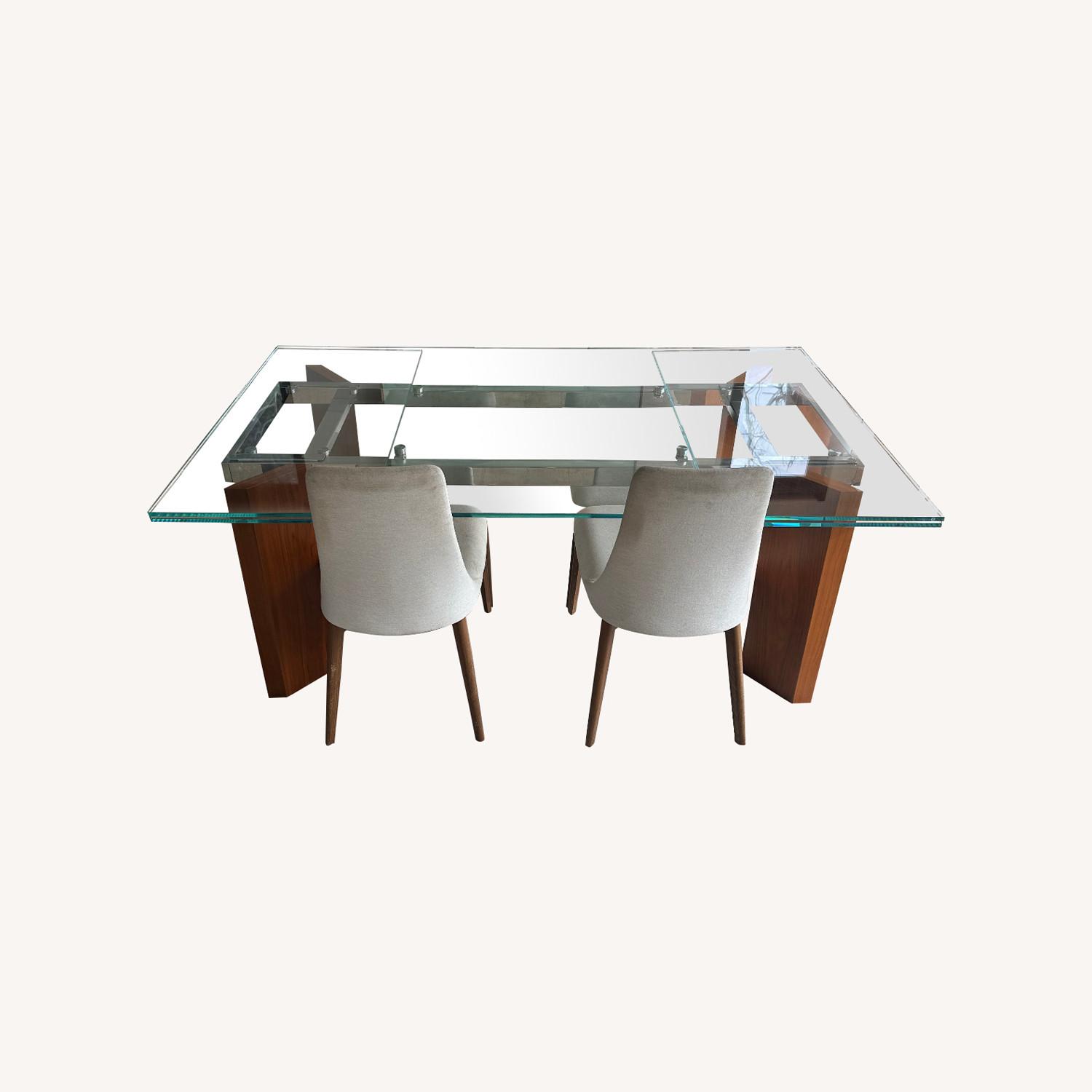 Seller's Notes:A beautiful, Italian-made modern extending dining room table from Calligaris Studio. We've loved this piece dearly, it was a great centerpiece of the room and conversation piece. It extends with minimal effort, with the glass leaves built architecturally under the table. It just needs a pull, and the patented extension system automatically extends the table. It made hosting big dinners super easy. It easily seats six people in its smallest size (71 inches long), 8 people with one leaf open (95 inches long) and 10 or more in it's largest size, with both leaves open (119 inches). We bought new for $5,500. It is in the now-rare walnut wood finish. Some chips on the wood (pictured) and small scratches on the glass, but otherwise in good condition.