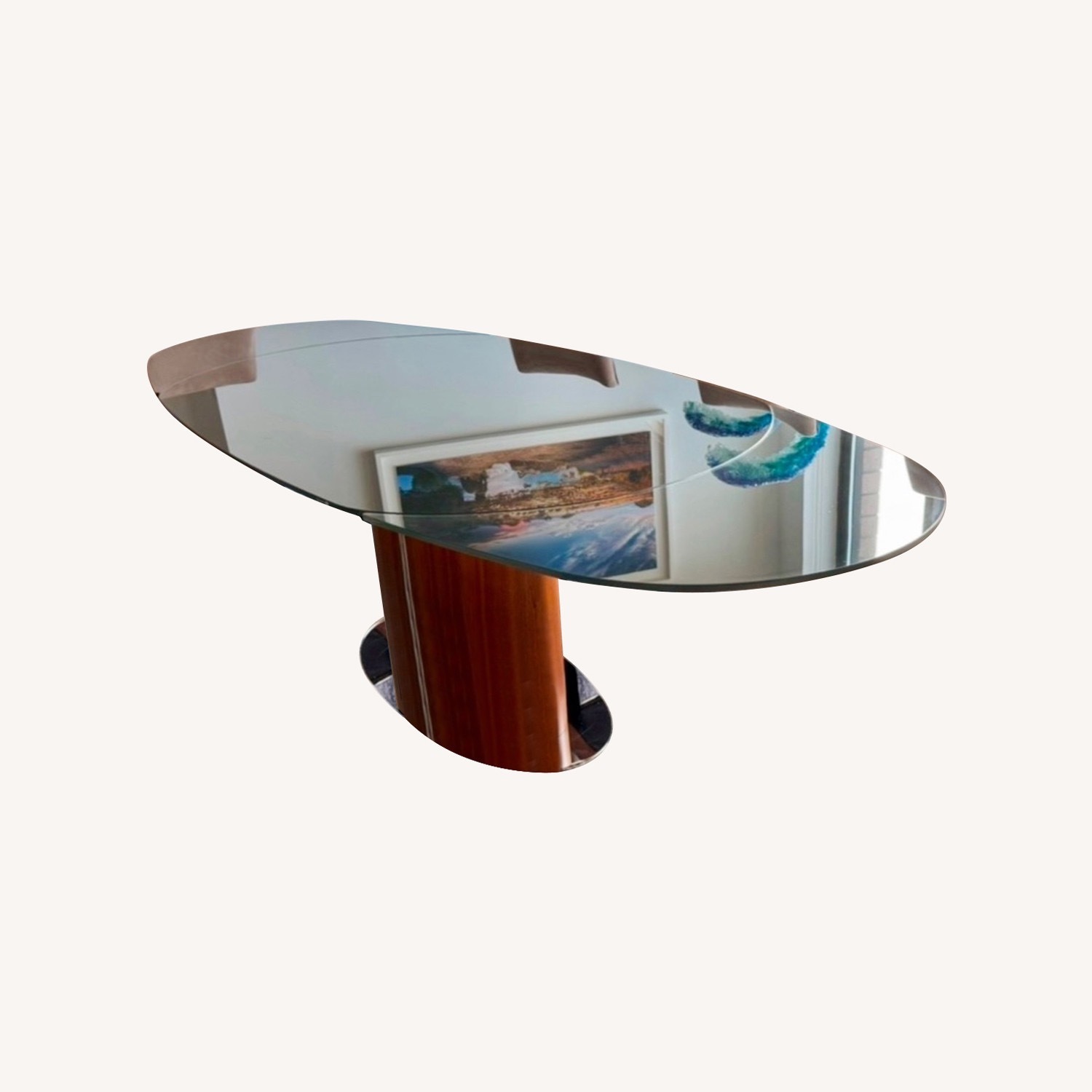 Seller's Notes:We bought this as our apartment dining room table, because it starts as a seating of 4 and can swivel open to expand to seat 8 comfortably as an oval table . We have had 12 around it for thanksgiving.. it's a beautiful black glass , has a small scratch .. the base comes apart from the glass and the mechanism works perfectly.