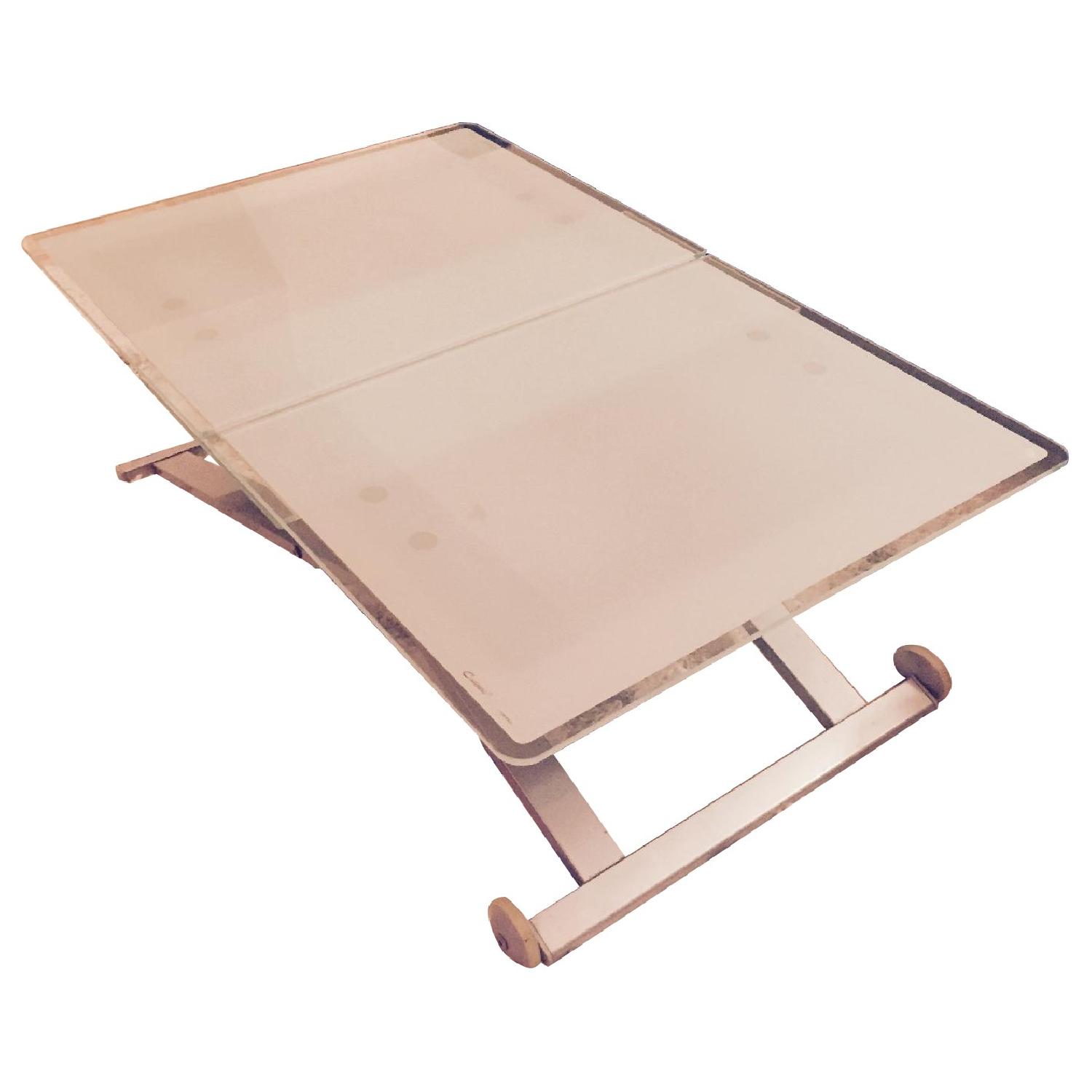 Seller's Notes:Design by Edi & Paolo Ciani. By Calligaris. The stylish Eleven Coffee/Dining table is truly multifunctional. In a matter of seconds, the Eleven Coffee Table becomes the Eleven Dining Table. Just press the button on the metal underframe to adjust it to one of the 7 heights available — from 16.7-29.3" high. The top can also be extended from 45-59" by shifting the two top leaves sideways and lifting a central extension leaf. Offered in Frosted Tempered Glass with Satin Steel base. Material: Tempered Glass Adjustable expandable table: Collapsed Width: 45 inches Expanded Width: 59 inches Height (Adjustable): 16 - 29 inches