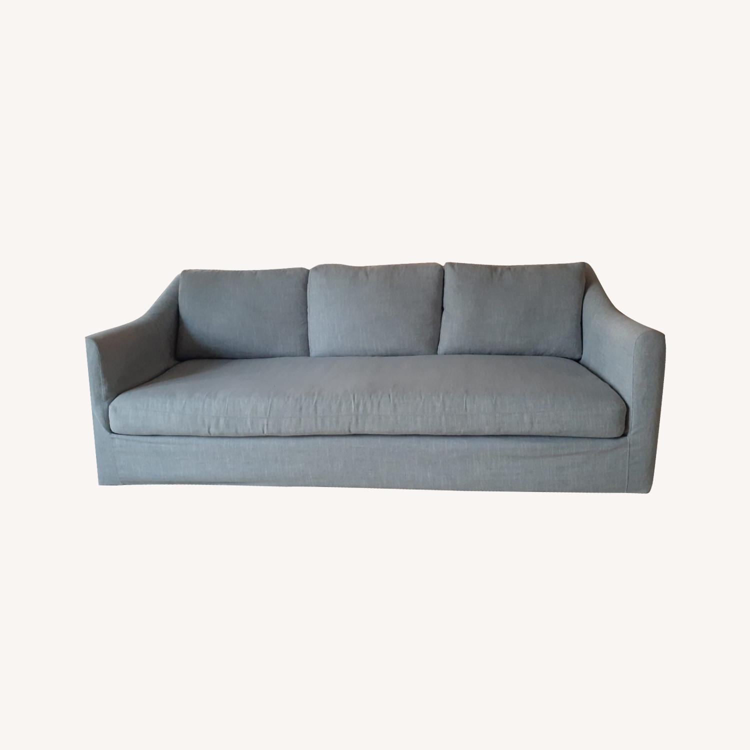 Seller's Notes:Calvin Klein Sofa has bench cushion and extra deep seat, in neutral gray covered slipcover.