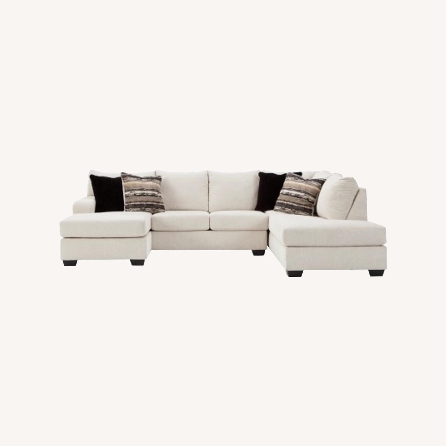 Let it snow. Doubling your pleasure with a double chaise configuration for ultimate indulgence, the Cambri sectional in a snow-tone neutral invites you to stretch your style in an easy-elegant way. Whether your aesthetic is urban hip or suburban chic, this posh sectional is sure to look and feel right at home. Wrapped in a chunky heavyweight chenille fabric with a delightful touch, this fashion-forward sectional includes designer throw pillows for a brilliant pop of color and texture.