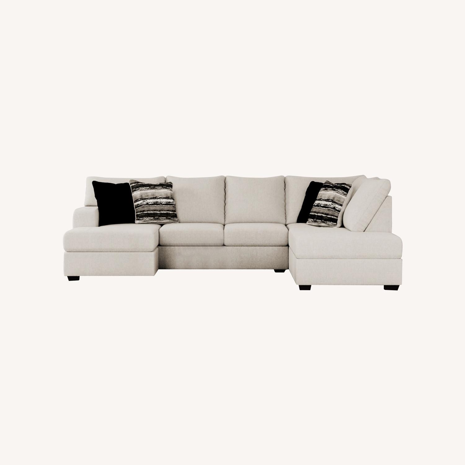 Let it snow. Doubling your pleasure with a double chaise configuration for ultimate indulgence, the Cambri sectional in a snow-tone neutral invites you to stretch your style in an easy-elegant way. Whether your aesthetic is urban hip or suburban chic, this posh sectional is sure to look and feel right at home. Wrapped in a chunky heavyweight chenille fabric with a delightful touch, this fashion-forward sectional includes designer throw pillows for a brilliant pop of color and texture.