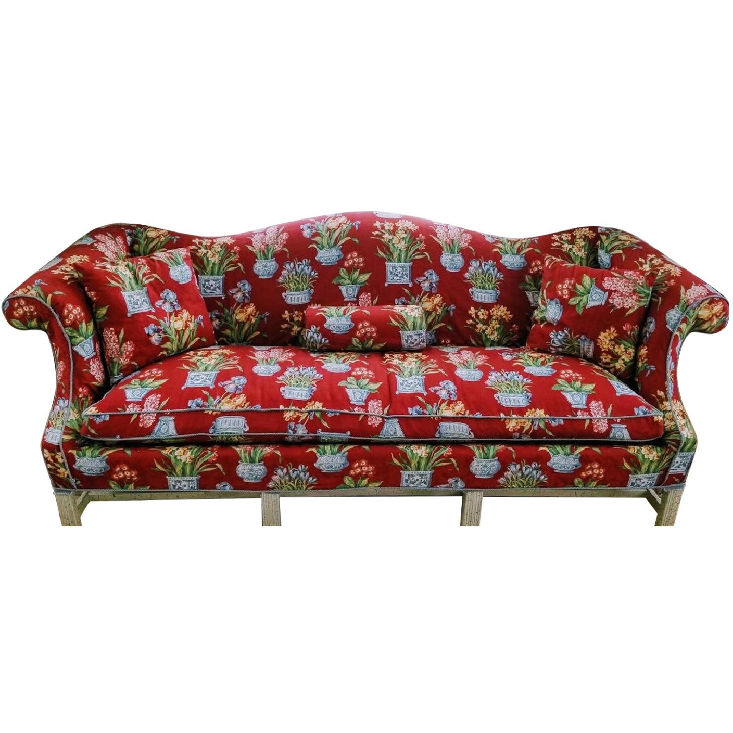 Seller's Notes:Lovely Camel Back Sofa with a red slip cover with blue prints. The left arm is a little loose.