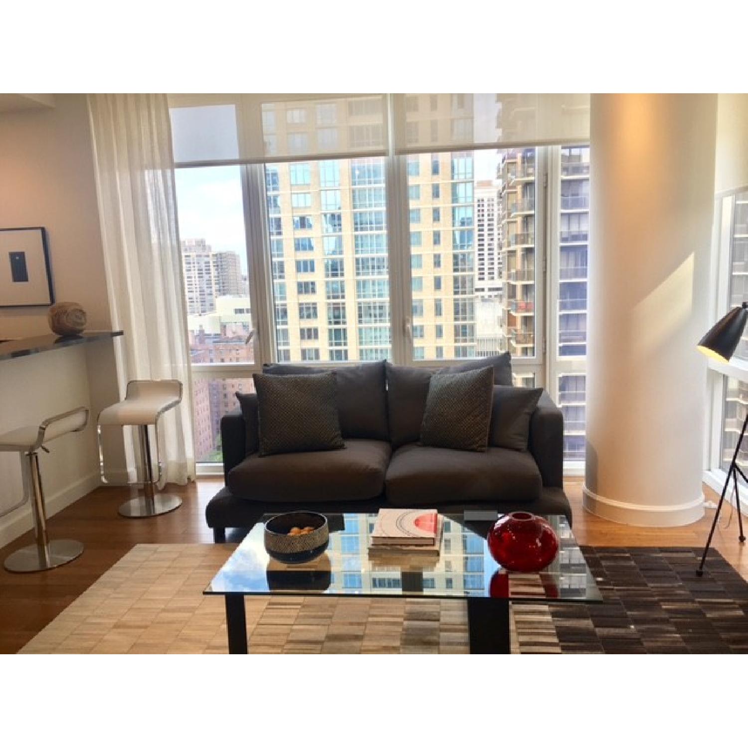 Seller's Notes:NEW (never used) Camerich brand Lazytime Plus Two Seat Sofa (blue/grey) for sale. (We are only selling because it came with our new apartment, and we already had a sofa in place when we moved). Description: A corner-blocked solid birch frame and blackened steel legs support feather down back cushions and high-resilient foam seat cushions layered with feather down. Fabric covers are removable. -In brand new condition; only used in show room apartment for showing prospects potential floor plans for the last six months by Glenwood Management in the Upper West Side "The Encore." If purchased, comes with two complementary fashionable pillows (detailed photos included - original value $150) with removable pillow covers. Measurements: 39"(W) x 25" (H) x 74" (L) Official product link: http://camerich.co.uk/range/sofas/lazytime-plus/two-seat-sofa/ Original price goes for $1800 USD.