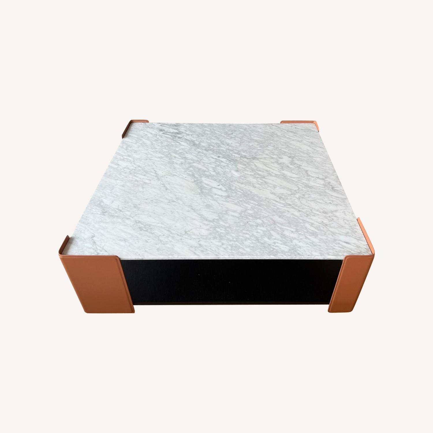 Seller's Notes:Hi, leaving the apartment unfortunately. The table is white marble, dark oak wood, held up by orange leather on the sides see attached.