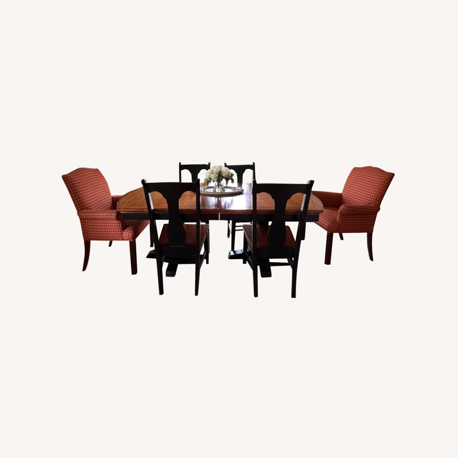 Seller's Notes:Dining set includes 12 two toned dining chairs, and the dining table. dining table has 2 18" wide leaves to expand to 114" and accomodate 12 seats total. Red chairs not included- available at my other listing. Mild blemishes on table as pictured. Quality construction.