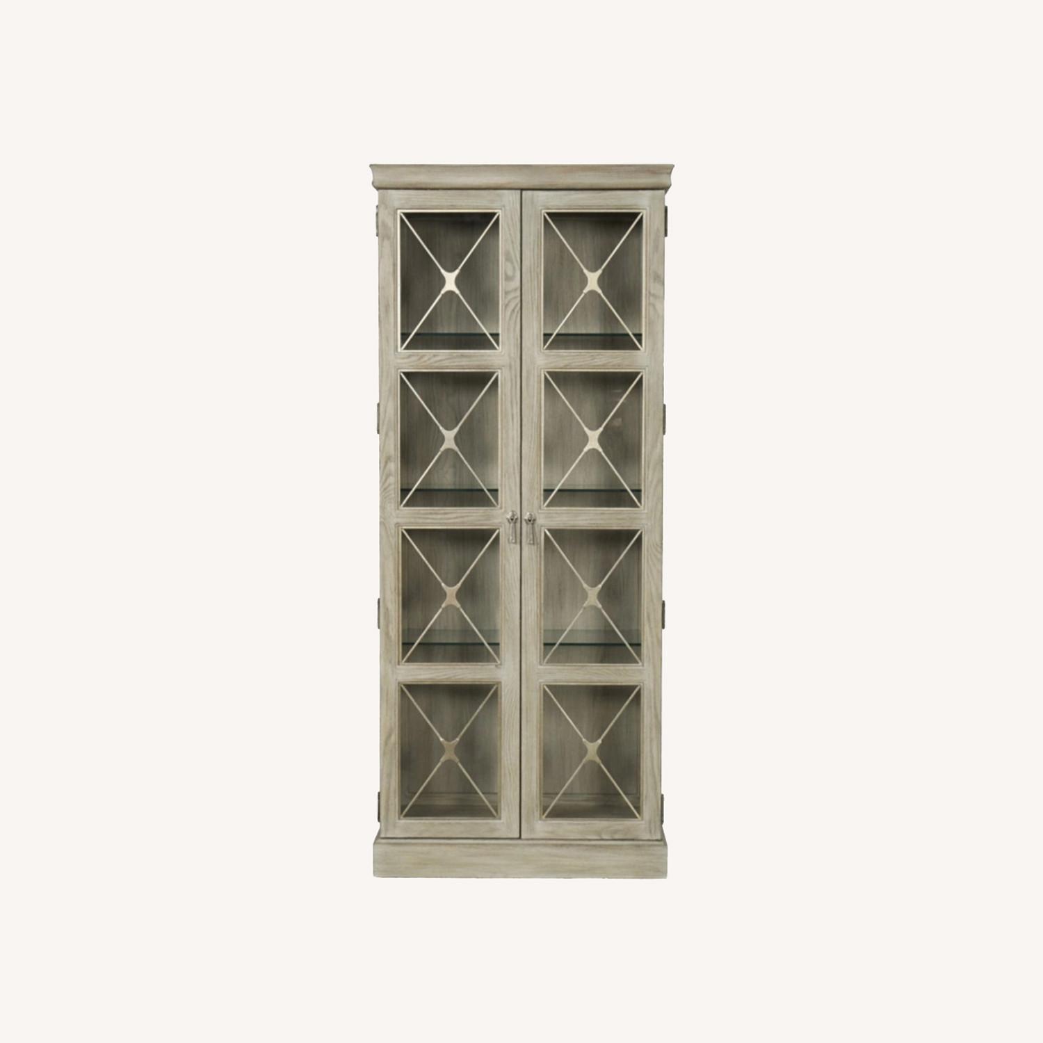 Seller's Notes:Our Candler Park curio china lets you put your favorite accent pieces, dinnerware and more on display. The glass doors feature intricate detailing for added style, and the dimmable touch lighting creates an elegant ambiance for your dining room. Multi-step, burnished grey finish Antiqued silver hardware Two glass doors with metal detailing Three adjustable, tempered glass shelves Dimmable touch lighting Levelers for stability Crafted from white oak solids with knotty and quartered white oak veneers Slight imperfections in the wood add to the beauty of this piece