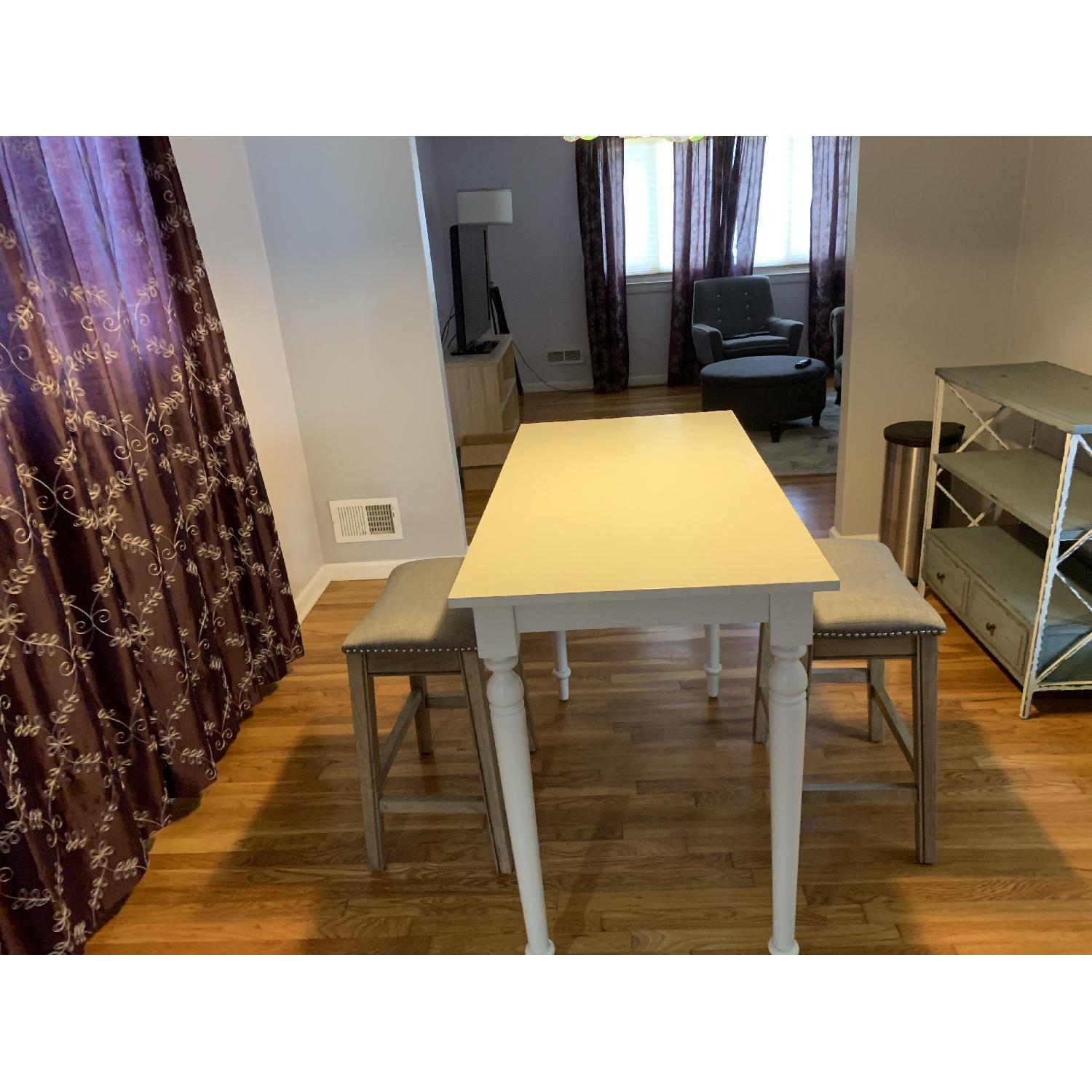 Seller's Notes:Farmhouse style, counter height, solid wood, white dining table plus two gray wood stools with hammered nail detail. Gently used for one year on special occasions. A couple of knicks on table top that no one will notice. Moving out, and not bringing with me. Table dimensions: Height 36". Width: 48". Depth: 24" Including two barstools with hammered nail detail: Height: 24 inches. Width: 18 inches,,
