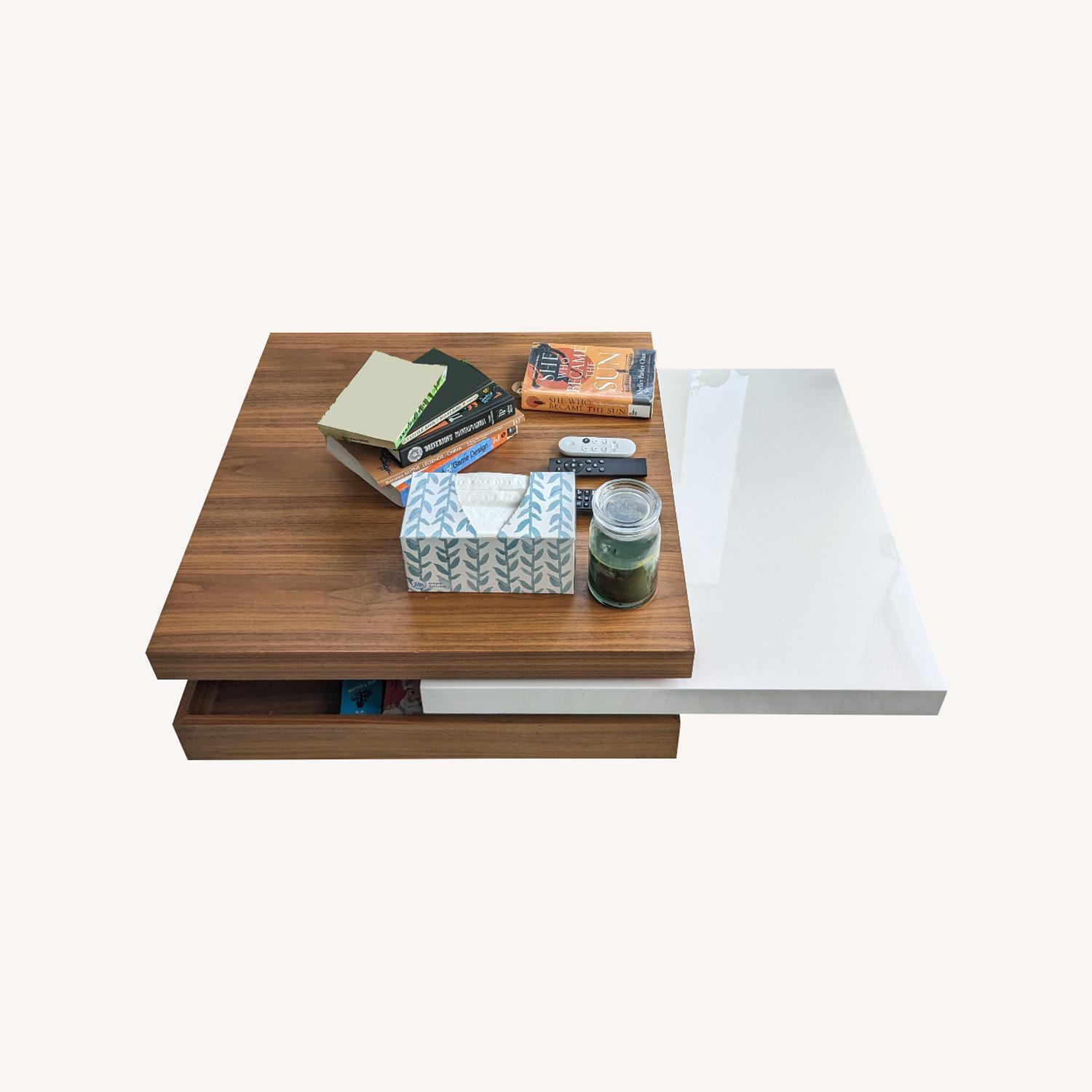 Seller's Notes:Material:Walnut Veneer & High Gloss Lacquer with Engineered Wood Finish:Clear Lacquer and White Stain Hardware Feature:Central Swing Mechanism Care:Wooden Table Prop65 Warning:FormaldehydeColor Variance:Natural Variations Dimension:W55" x D27.5" x H13" Table Top Thickness:2.4" for Top 2 Layers Product Weight:81.6 lbs Packaging Dimension:1 Box Leg Height:2.9" Drawer Capacity:W41.3" x D12.9" x H2.9" for Bottom Layer Max Bearing Support:15.4 lbs ~DU
