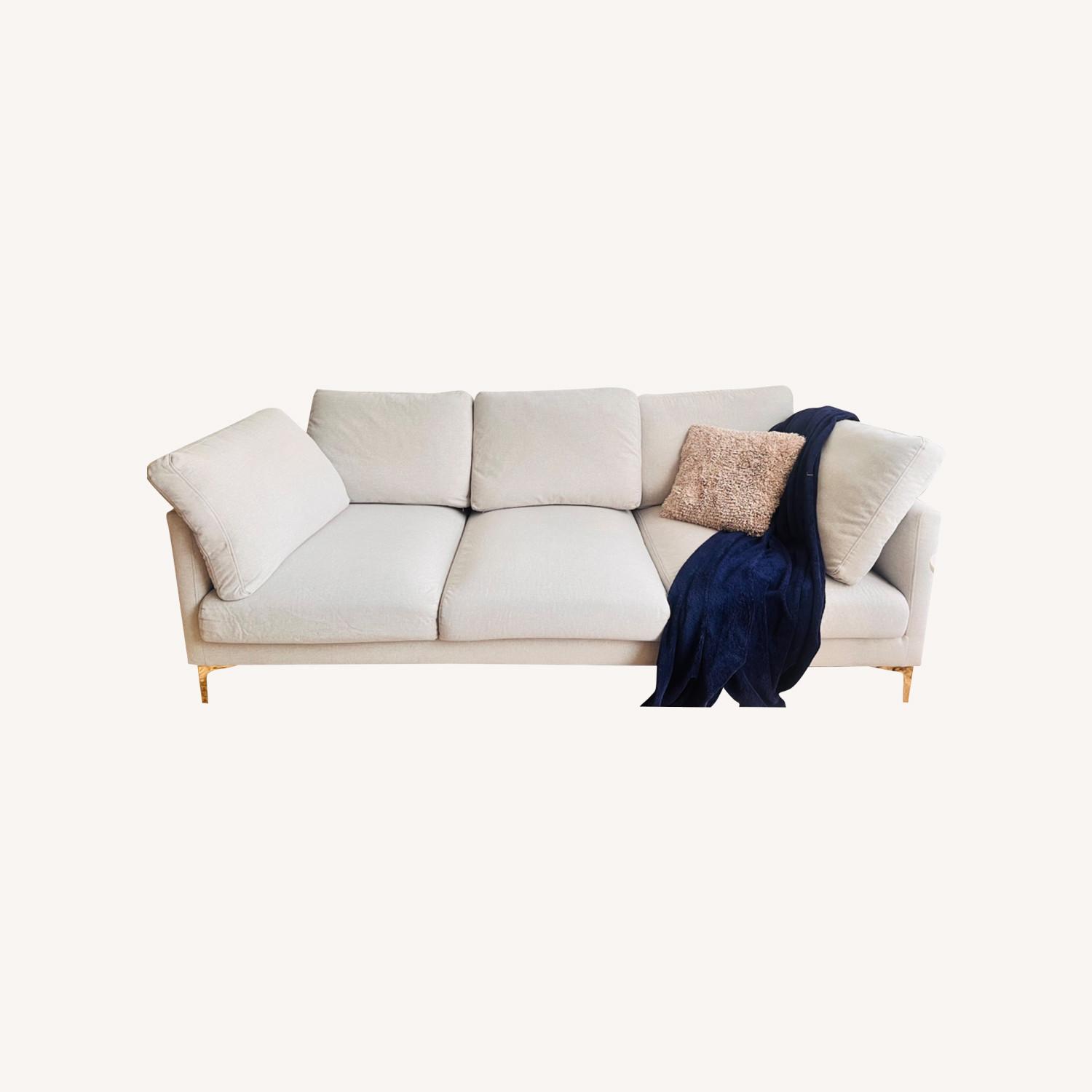 Seller's Notes:84” 3 seater dove gray sofa with elegant gold legs. Removable Seat and Cushion Covers- machine washable. Spot clean fabric. Dimension: W84.6" x D35.4" x H33.1" It is in excellent condition, as good as new. No wear and tear. Recently dry cleaned. Purchased 1 year ago. Original mrp- $1299 https://www.castlery.com/us/products/adams-sofa