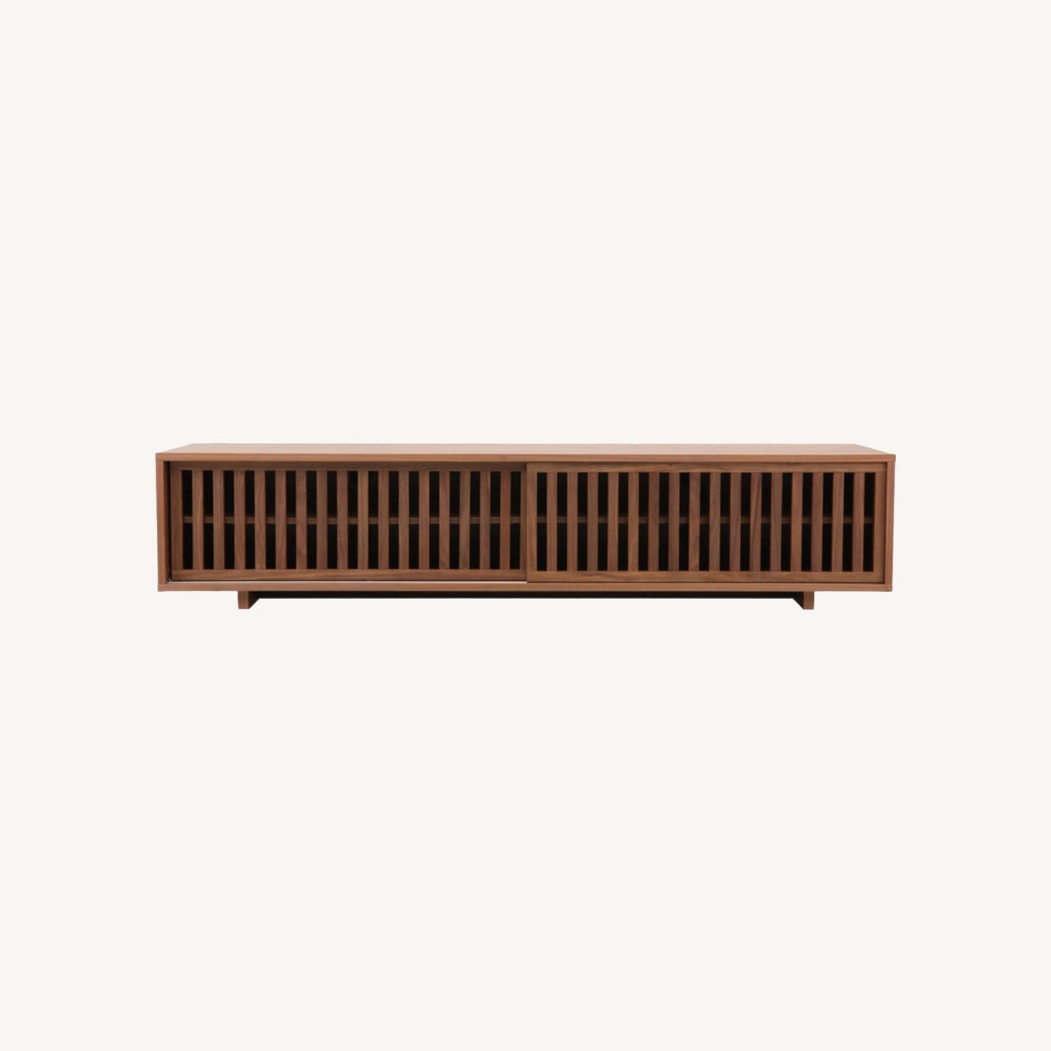 Seller's Notes:"The Luka TV Stand is balanced and unassuming. Its beauty is found in the high grade, American oak veneer. Its strong symmetry and slatted sliding doors make Luka an iconic design. The slats not only allow air to flow freely around your equipment, keeping them cool, but also allow the infrared signals to pass uninterrupted to your devices. The Luka has four cable management portals at the back to keep those wires under control." This item has some damages to the front left side where the top is lifting from the base, this could possibly be repaired by the savvy customer!