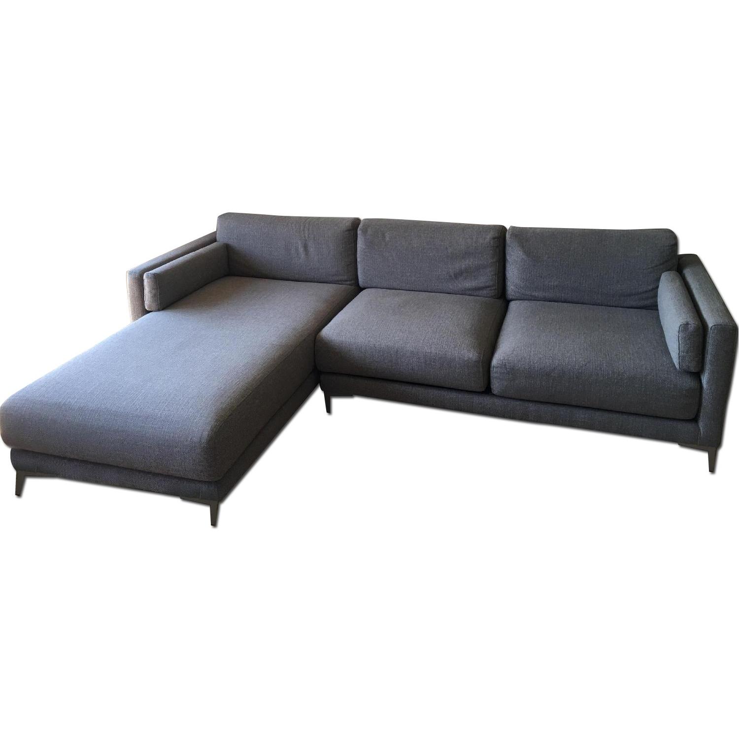 Seller's Notes:A modern sectional to stretch out on. Left/right configuration lounges long and low with overscaled cushions and two arm pillows with extra cush. Chenille-soft grey/natural basketweave is punctuated with tapered "L" legs and a minimalist gleam of brushed aluminum. Overall Dimensions Width: 107" Depth: 75" Height: 26" P1: Left Arm Sofa Width: 67" Depth: 40" Height: 26" P2: Rt Arm Chaise Width: 40" Depth: 75" Height: 26" Seat Height Height: 16" This sofa was used for 3 months.
