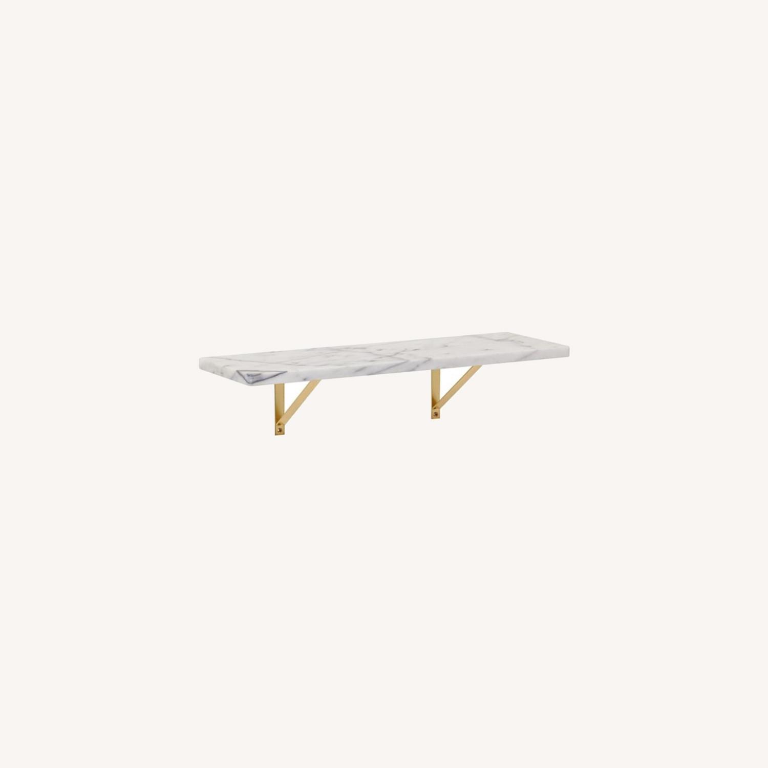Seller's Notes:CB2 white Marble Wall-Mounted Shelf 24". Original price $69.95. Shelf is in excellent condition. Honed Carrara-style white/grey marble Due to natural material, color and veining will vary; each is unique Metal brackets with brass finish Mounting hardware included
