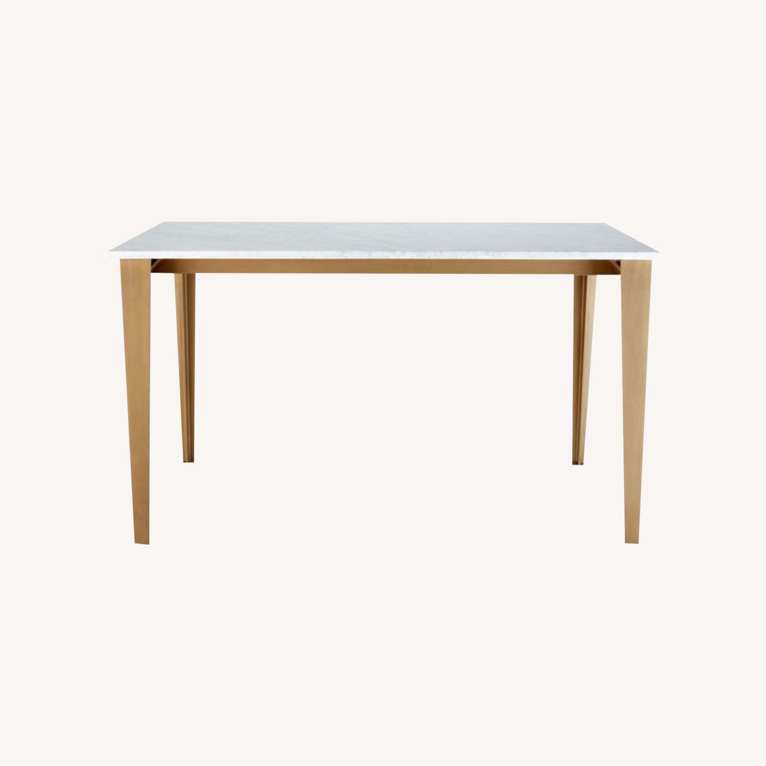 Seller's Notes:We love this marble table from CB2 but it no longer fits in our space and we need to find a good home for it! It has been gently used and is great condition with just a few blemishes on the marble surface. Here is the description from CB2: "In a modern nod to French kitchen style, marble meets industrial to dine a party of six. Authentic 3/4-inch slab of white Carrara marble with grey veining is polished smooth and finished with a clear sealer, extending just over the edge of contrasting iron base. Warmed with an antiqued brass finish, sculptural bent metal legs taper down to a refined angle, creating an elegant footprint."