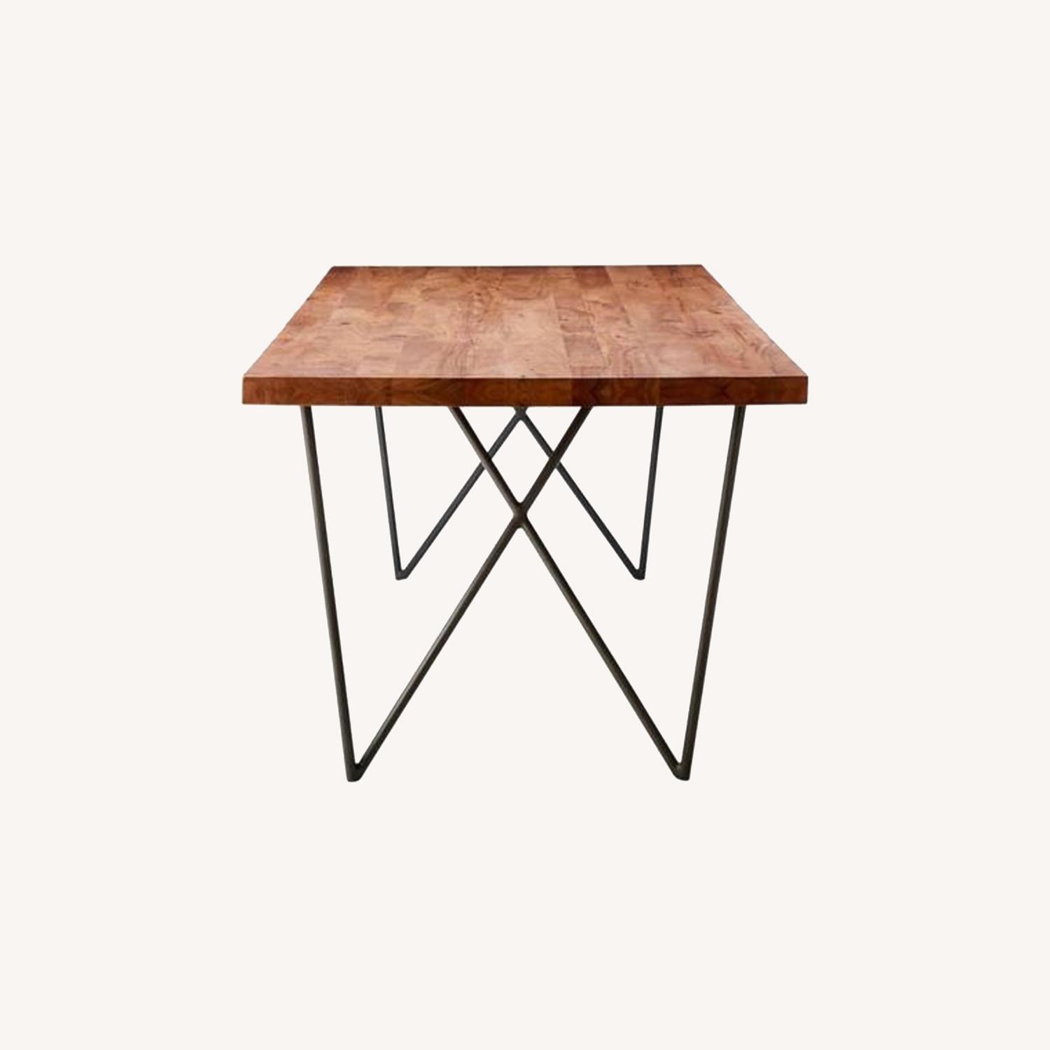 Seller's Notes:36” x 80” CB2 “Dylan” dining table. Seats 8 people comfortably, but can fit up to 10 people. Acacia wood top with iron “W” legs. Sealed with water based clear lacquer. Rarely used, in like new condition. Original price $999. https://www.cb2.com/dylan-36x80-medium-acacia-dining-table/s550247