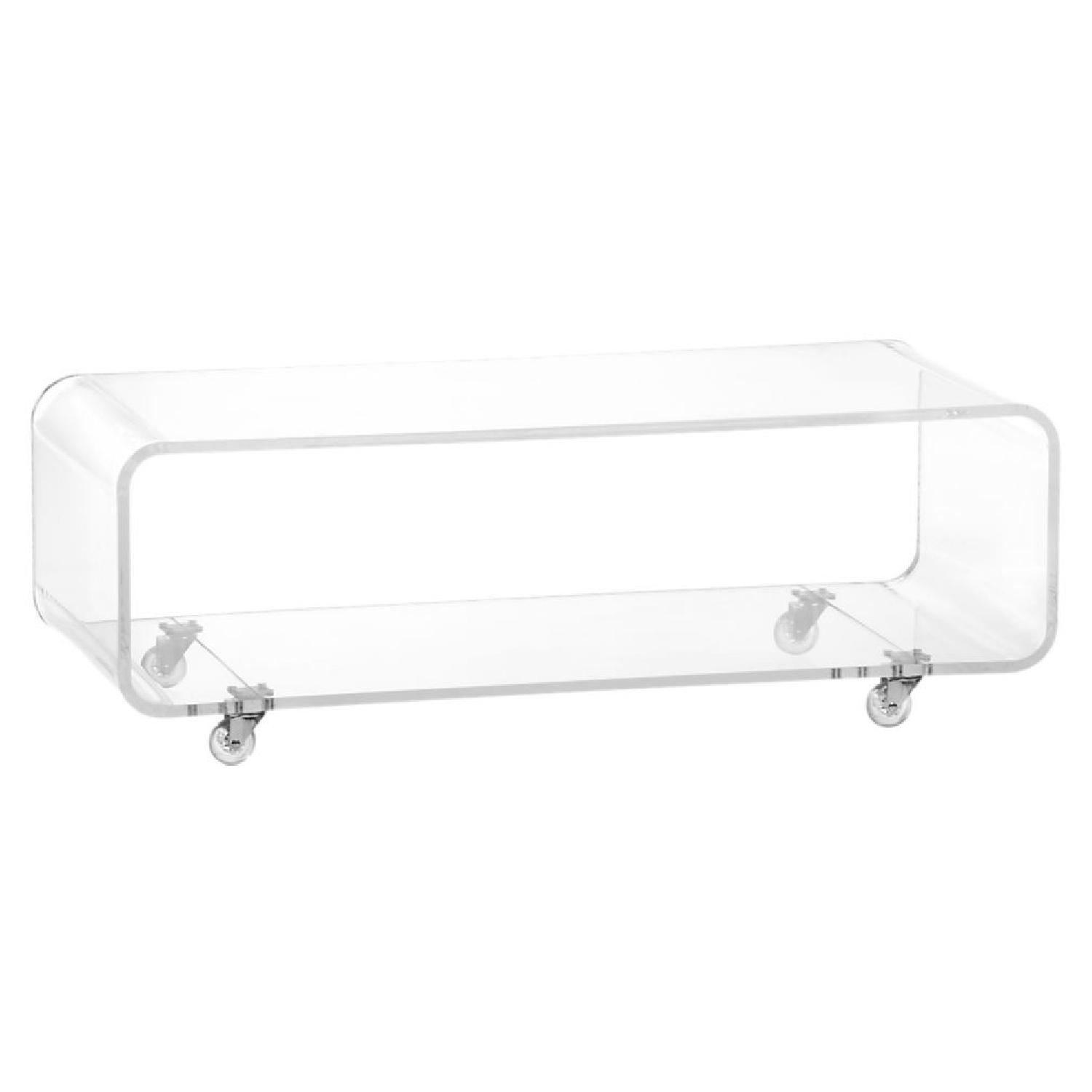 Seller's Notes:- CB2 acrylic sheek coffee table on wheels