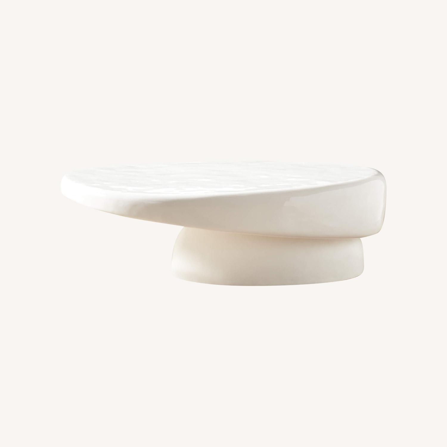 Seller's Notes:Fabricated of cast concrete, Brooklyn-based designer Caleb Zipperer's oval coffee table emphasizes its organic silhouette through compelling, complementary textures. The warm white finish is supremely glossy on top to draw attention to the table's soft, undulating surface. Beneath, the matte base lends subtle contrast. Elegant in its simplicity and eye-catching in its execution, Alastor is a dramatic anchor for the living space. CB2 exclusive.