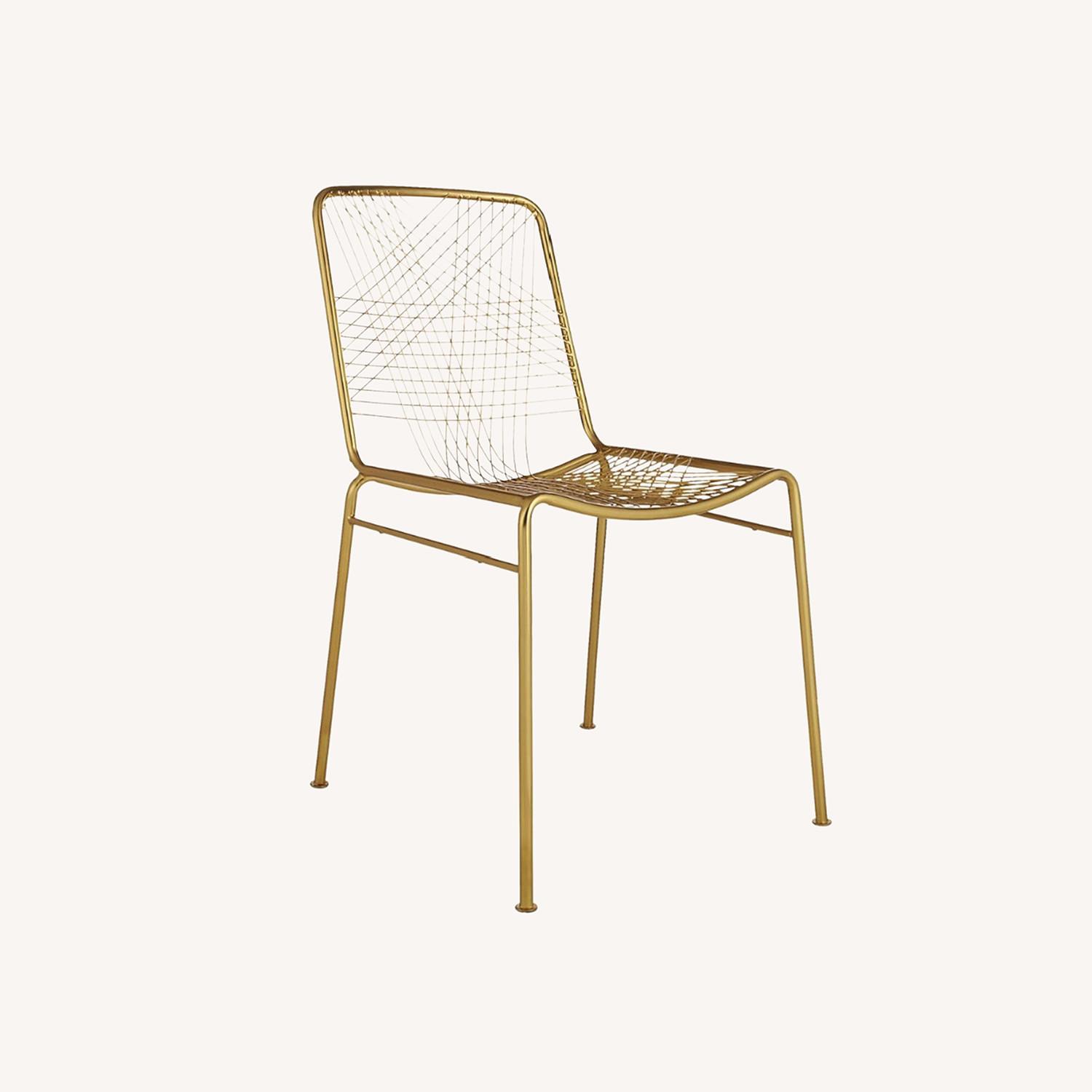 Seller's Notes:Modern metallic lacquers handmade iron frame with woven wire back expertly welded into a graphic linear pattern. Coated in brilliant brass, chair glamorously juxtaposes our wooden dining tables or adds shine to the home office. alpha brass chair is a CB2 exclusive.