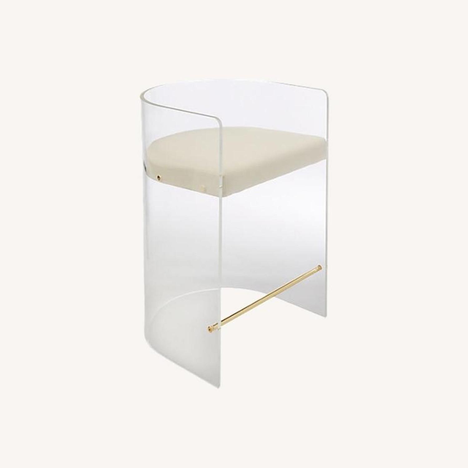"Decorator's dream. This show-stopping stool has a high-end vibe you can't match for the price. Designed by Ceci Thompson, the graceful curve of the back holds a special allure--""it feels quite luxe, but also has a vintage appeal."" Formed from a single piece of molded acrylic, sculptural frame supports a plush, velvety seat in warm ivory with exposed brass hardware. A true conversation piece, counter stool seems to float in space, looking elegant at any angle. Learn about Ceci Thompson on our blog. CB2 exclusive. • Designed by Ceci Thompson • Acrylic frame with exposed brass hardware • Velvet blend in warm ivory • Lumbar pillow recommended for added comfort • Wipe with a soft, damp cloth; avoid cleaners with acetone or ammonia • Made in Taiwan "