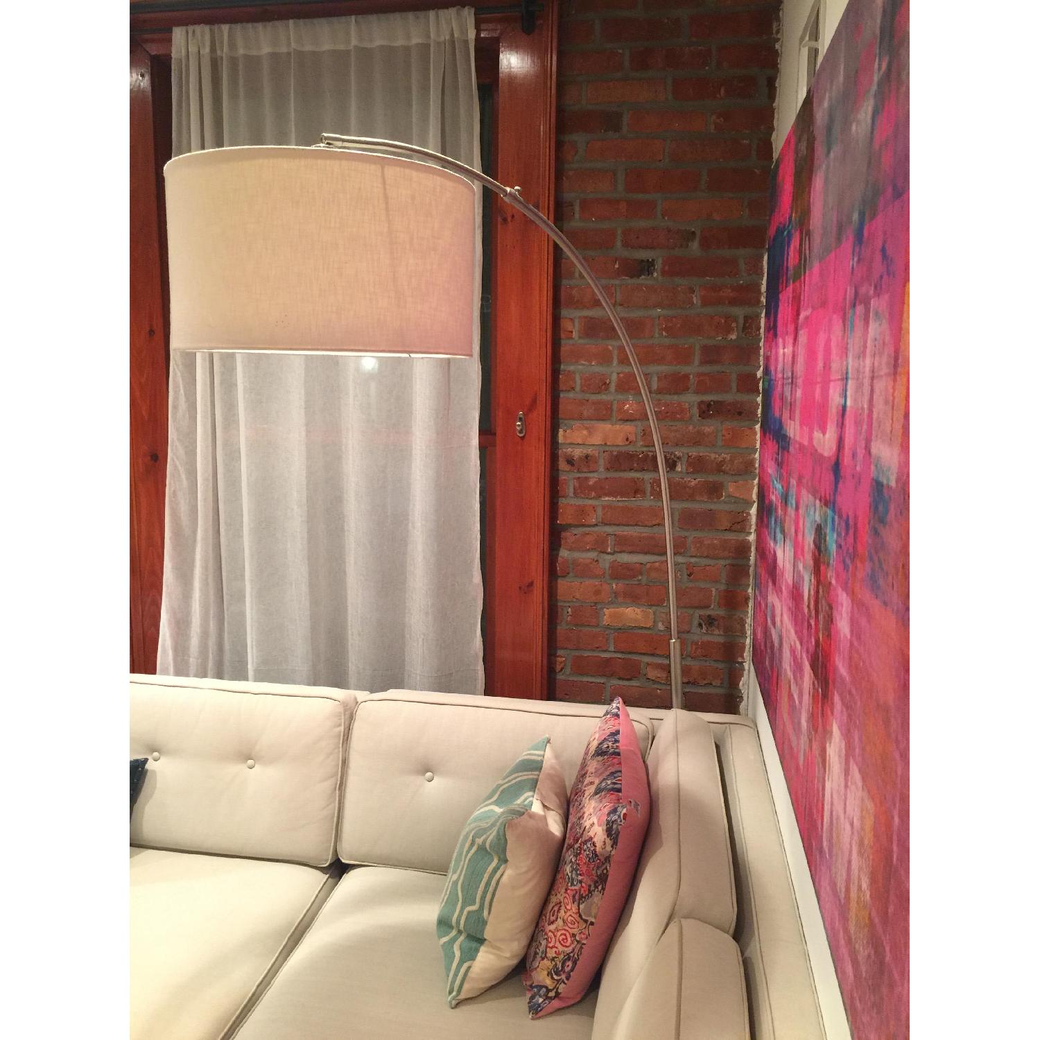 Seller's Notes:arch rival. A simple brushed round nickel base grounds a wide sweeping arc over six feet high, culminating in a slim ring of cotton/poly with naturally occurring linen slubs. Matching fabric diffuser conceals bulb, softens the glow. Full-range dimmer adds to the light show. A dramatic arc over sofa or chaise. Or a novel un-chandelier over the dining table. Foot dimmer switch. 150W bulb (not included). big dipper arc brushed-nickel floor lamp. 73"wx18"dx83"h Handmade steel base with brushed-nickel finish Off-white cotton shade has diffuser 23W dimmable CFL included; also accommodates 150W max. incandescent bulb (not included) learn more Foot dimmer switch ETL-listed learn more Made in China
