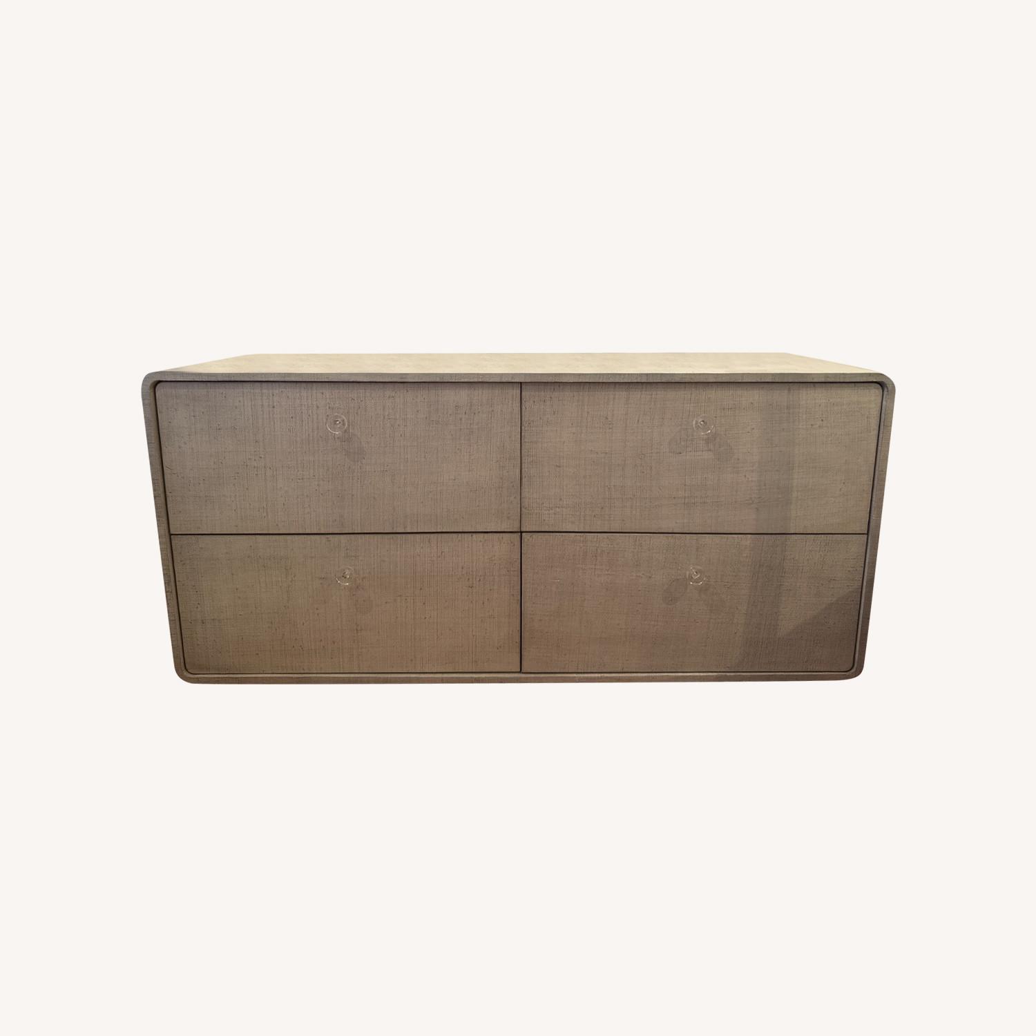 Seller's Notes:Curvy low dresser gets an unexpected layer of luxe linen. Lacquered for durability then finished with a grey wash for depth of color and interest. Four generous drawers feature clean acrylic knobs. We love the texture and sophistication it adds to any space. Learn more about Jannis Ellenberger on our blog. CB2 exclusive. Designed by Jannis Ellenberger Natural linen over engineered wood Acrylic knobs Made in Vietnam ~RL