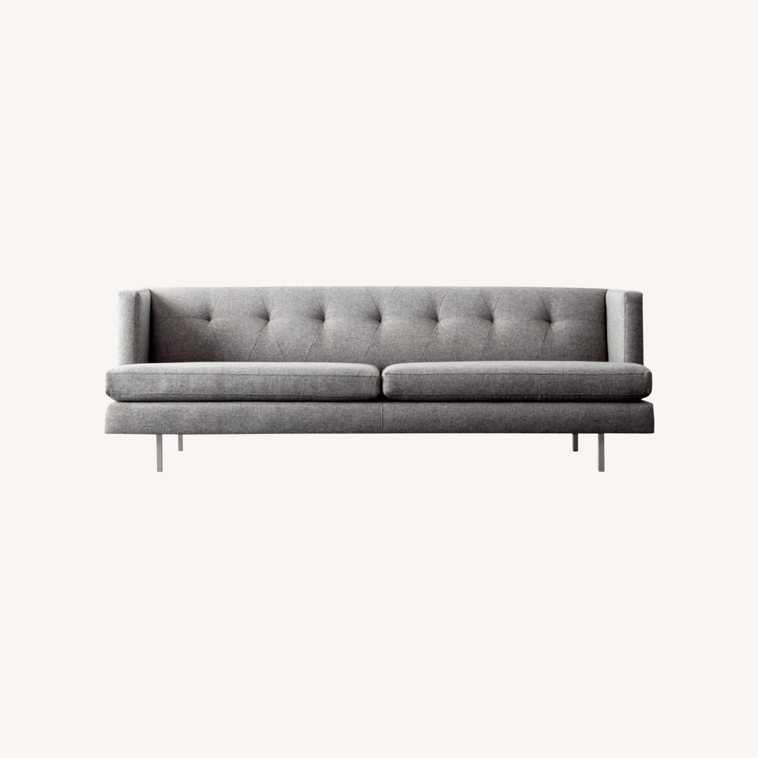 Seller's Notes:A stylish and modern sofa upholstered in a tasteful grey fabric and standing on brass legs. While spatious, it does not feel bulky can can help a room feel light. Fits about 3 people and is in great condition! Selling due to moving.