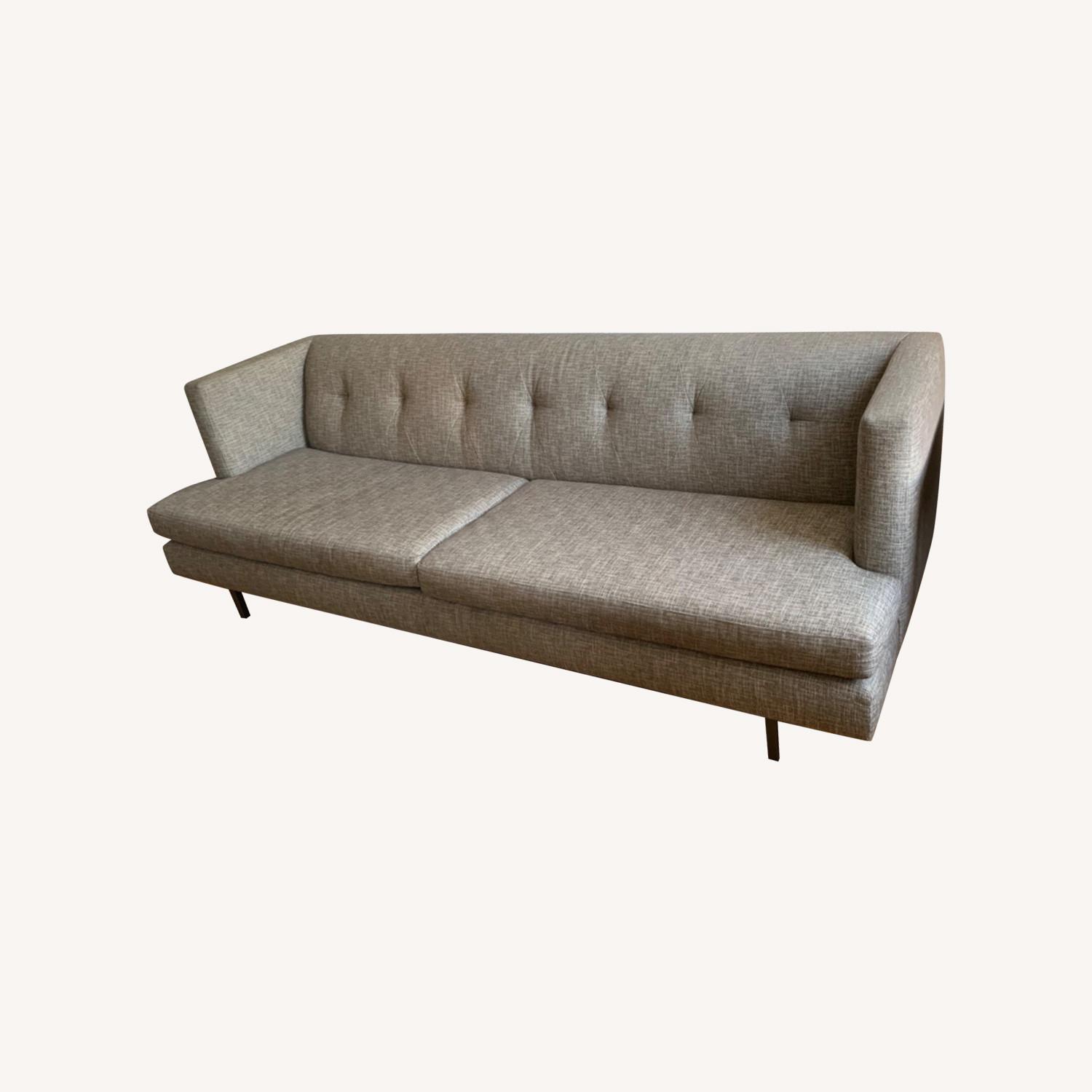 Seller's Notes:CB2 Avec Sofa Couch. Gray fabric upholstery, dark gray metal legs. Comes from pet-free, smoke-free home. Width: 87 inches, Depth: 34.5 inches, Height: 29.5 inches Seat depth: 22 inches Good used condition. Very comfortable to lounge on, big enough to have a guest sleep on. Not saggy, on the firmer side. No noticeable stains on fabric. Some minor pulling in the fabric, mostly on the sides (see last pictures for detail). Parisian lines. Inspired by a French flea market find, this sofa's long slim lines, cutback retro arms, low tufted back and generous seat cushions rest on modern brass stiletto legs for an unexpected design twist. • Poly fabric: Grey • Frame is benchmade with certified sustainable hardwood that's kiln-dried to prevent warping • Seat cushion is soy-based polyfoam and fiber • Sinuous wire spring suspension • Removable metal legs with brass powdercoat finish • Benchmade in North Carolina • Vacuum regularly • Made in USA of domestic and imported materials