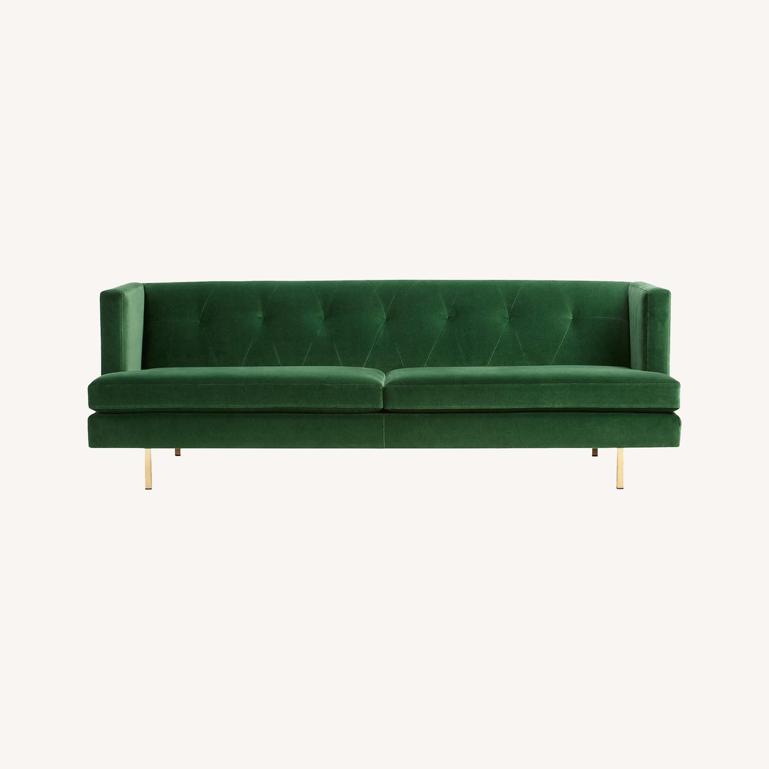 Seller's Notes:Original Price is $1,599 with tax, shipping and handling $1,903. We love this sofa and are parting ways only because it doesn't fit in the apartment we are moving to. It is super comfortable and the right depth. We bought it in 2019 and ended up leaving the city for over a year during the pandemic, so this has gotten very minimal use. We always get compliments on it, it feels very elegant and it elevates the living room. The style was inspired by Parisian sofas. It sits 3 people comfortably, and up to 4. The fabric is a rich emerald green that feels and looks like velvet. It has normal wear and tear, no specific blemishes, just as with any velvet fabric depending on which direction you stroke it the sheen can change. The legs are brass color. Width: 87" Depth: 34.5" Height: 29.5"