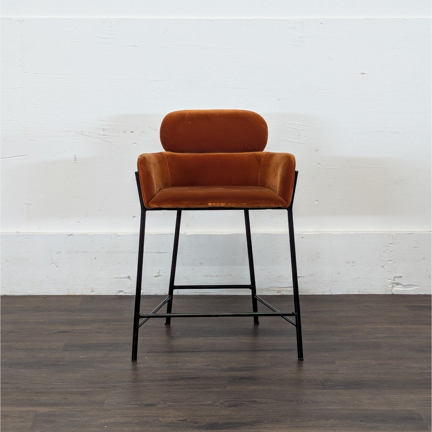 Seller's Notes:Designed by Caleb Zipperer and curved with two tiers of comfort. Sits plush with bottom tier sized right for arm resting. The velvet upholstered stool rests on a powder coated iron base.