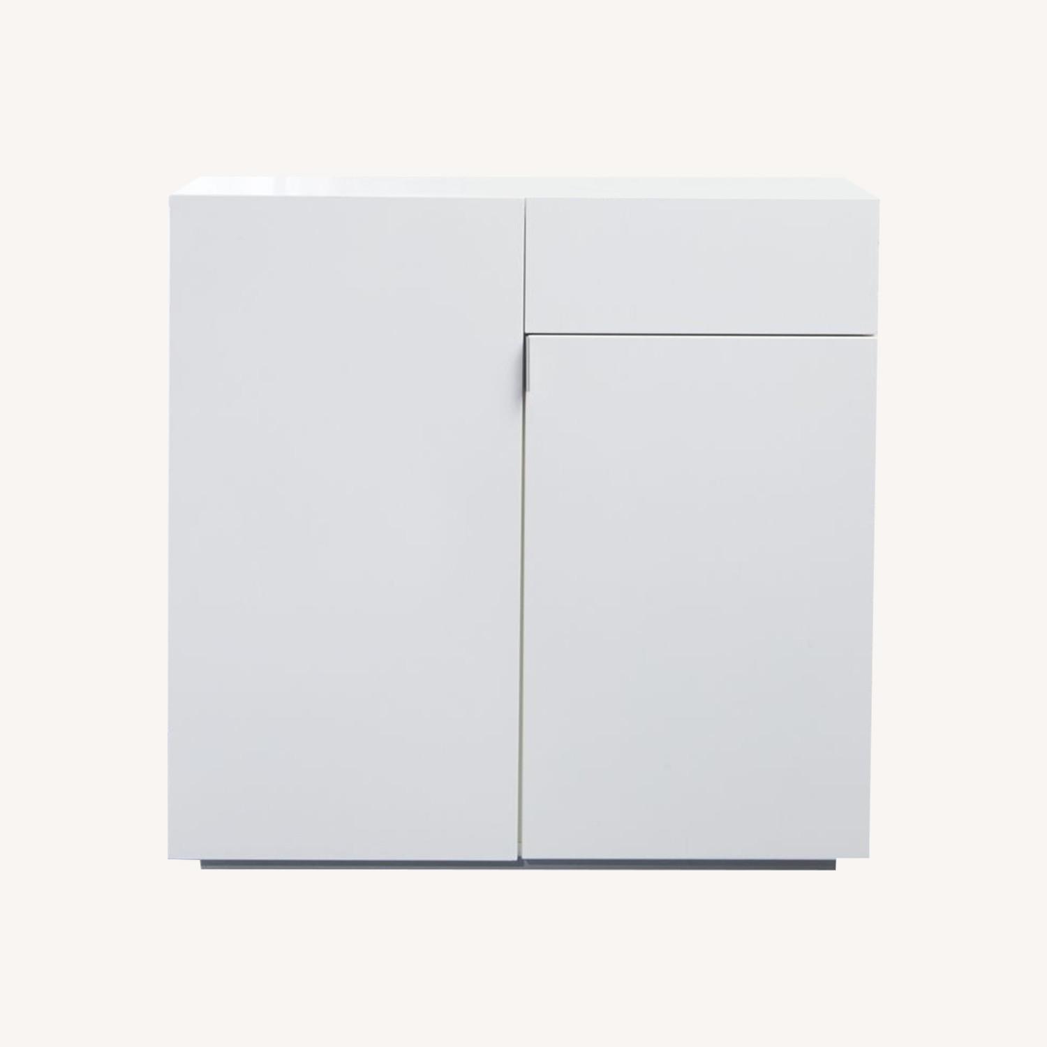 Seller's Notes:Sleek cabinet slicked hi-gloss white inventories a fully stocked bar. Bottles and barware stash behind doors: left hides one fixed cubby shelf over removable X wine rack; right conceals one fixed shelf, exposes one slim brushed aluminum pull. Bartending drawer for corkscrews, coasters, napkins, tools of the trade...maybe even a Toblerone. ~CGSP