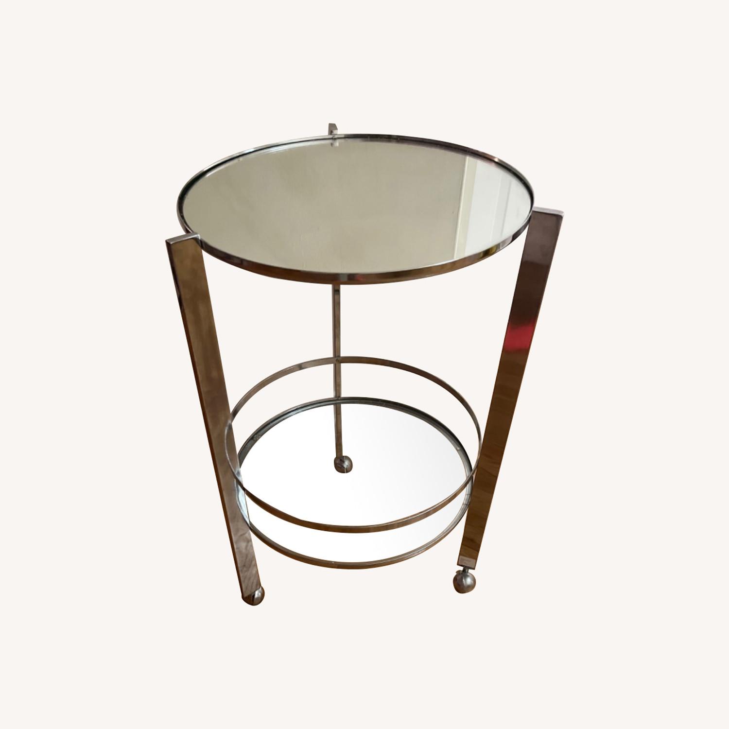 Seller's Notes:Seller's Notes: Contemporary bar cart in signature CB2 style. Works as a bar cart, side table, or nightstand (has been used as all three in it's lifetime)! Great condition - used mostly for decor vs. function. Selling as part of a full apartment remodel. CB2's original description: Retro cocktail ritual rolls new-fashioned in swank design by MASHstudios. Gleaming chrome double-decker interchanges mirror/glass discs to wheel in drinks, nibbles, bartender tools. Genuine CB2. ~RL