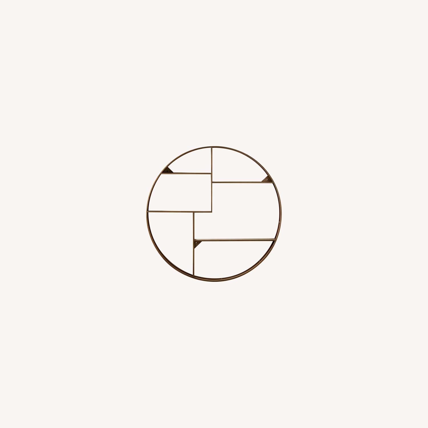 Seller's Notes:Iron-framed wall shelf is the perfect marriage of form and function thanks to its unique round shape and antique brass finish. Display photos, books, objects and more on the staggered shelves. CB2 exclusive. Genuine CB2.