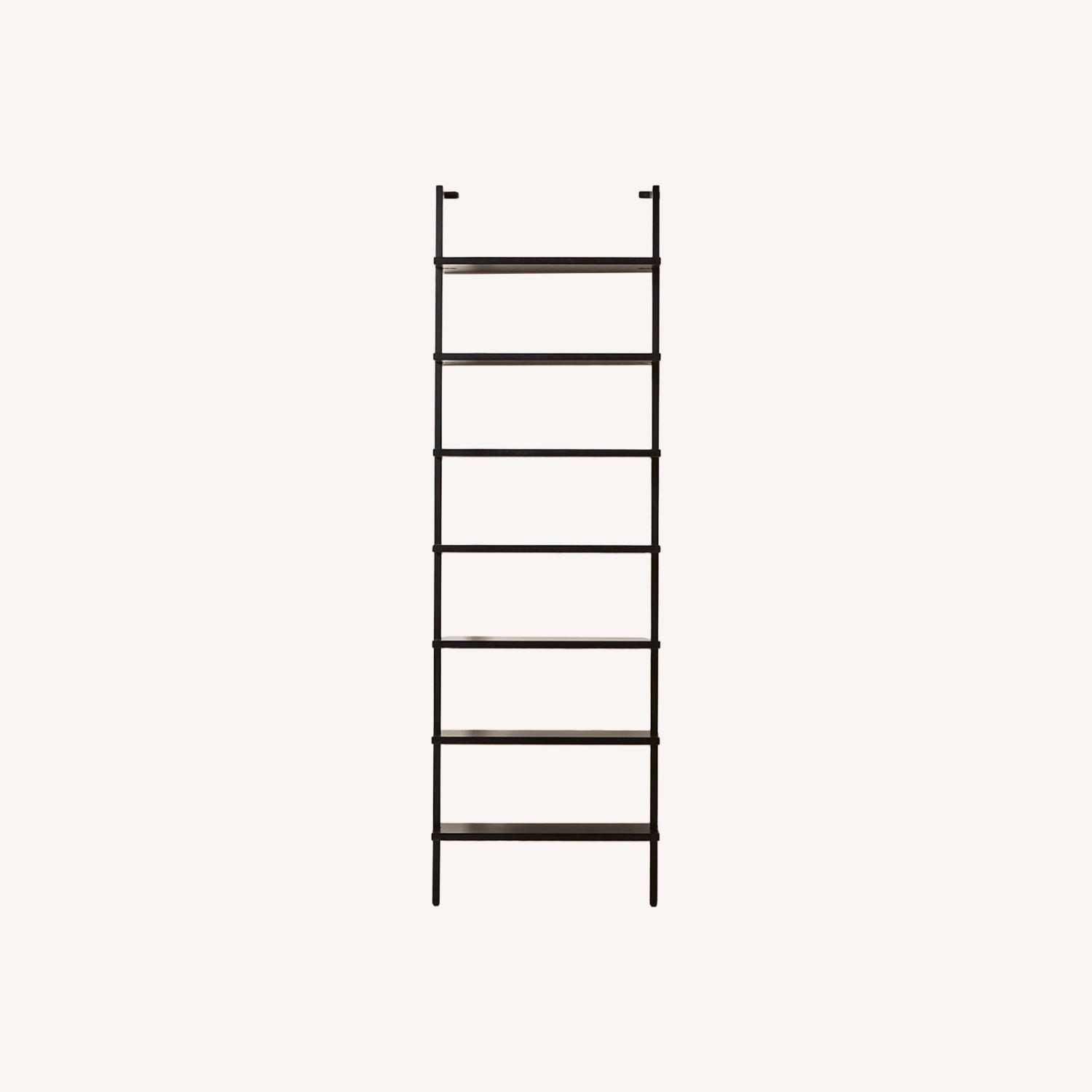 Minimalism scales to the max in a modern rise of black. Seven shelves ladder sky high (a CB2 record high at 8 feet) in engineered wood with dark lacquer. Powdercoated aluminum frame with hidden hardware accentuates neutral black construction. Mounts sturdy to the wall. Create a vertical work space with Stairway Black Wall Mounted Bookcase. CB2 exclusive.