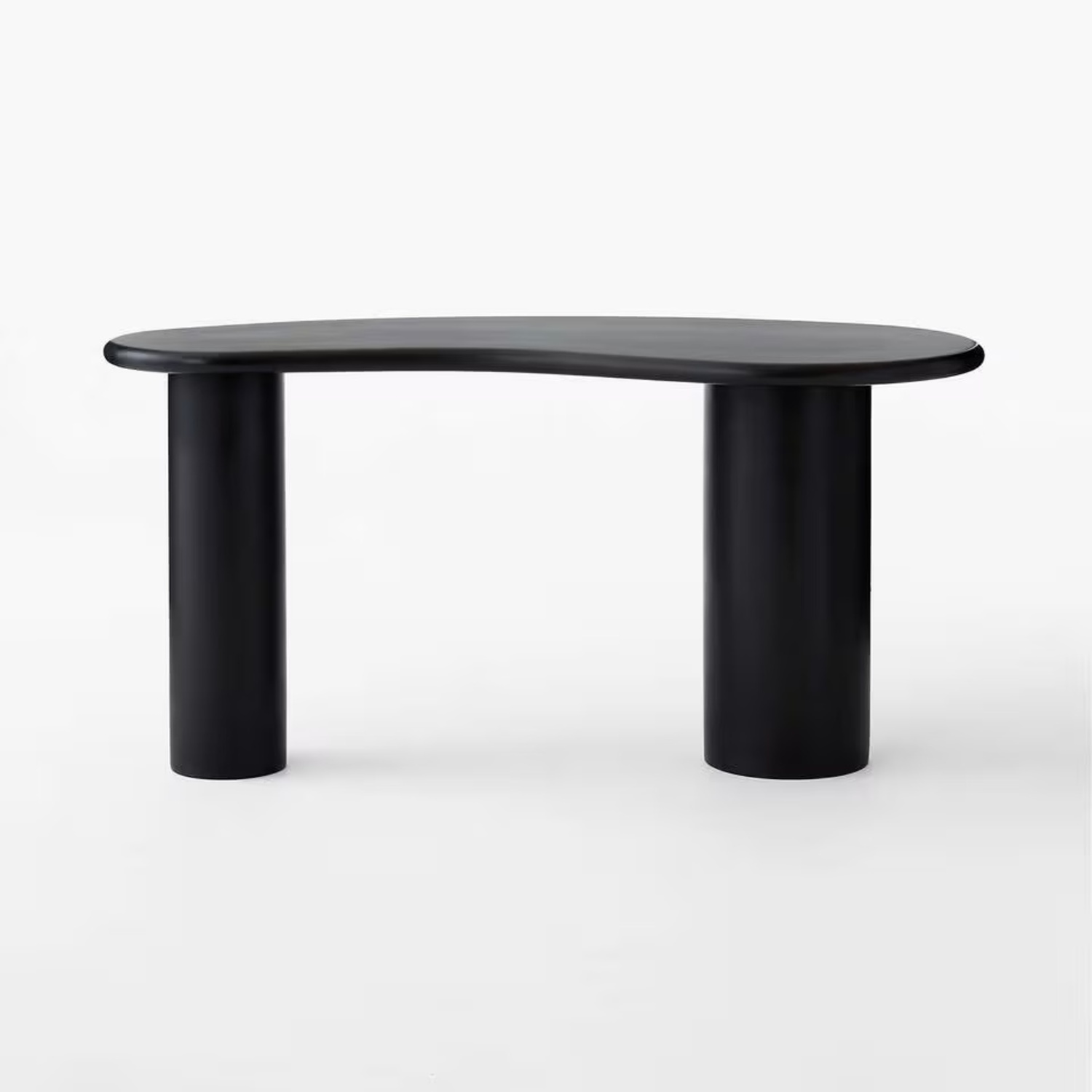 Designed by Barcelona-based Mermelada Estudio, modern desk lends drama to a design-forward home office. Unexpectedly rendered in a soft satin black resin, desk evokes modern biomorphic design with a softened kidney-shaped top. Echoing the organic form are two mismatched cylindrical legs for support. CB2 exclusive. Mermelada EstudioFiberstone, a composite material, with satin black resin coating Made in Vietnam