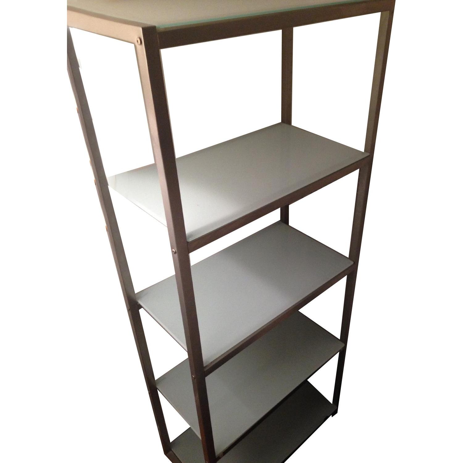 Seller's Notes:This lovely, functional bookcase has been tucked in a corner of my apartment almost unused since I got it. Eventually I realized it deserves a new home where someone will actually utilize it. Its farm is aluminum with frosted glass shelves and has easy clean lines. There are 5 shelves in total.