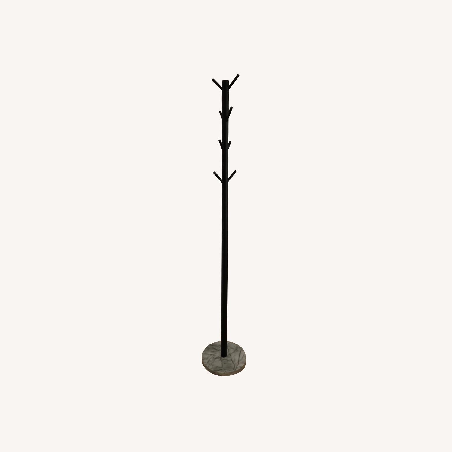 Hang time. Modern black iron tubing grounded in minimal white marble is as simple and elegant as it gets. Designed sleek and slim for efficient use of space, rack hangs coats, purses, hats, bags in the entry or mudroom. Works with any decor.