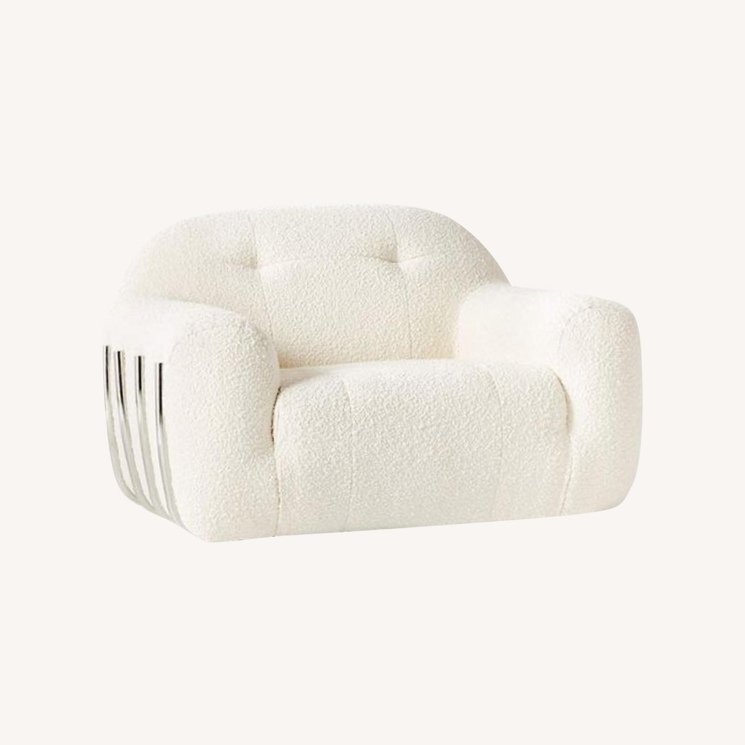 Seller's Notes:1970s Italian-inspired chair designed by Jannis Ellenberger makes lounging look vintage. Curvaceous design is wrapped in a creamy ivory boucle that brings soft texture and dimension to the piece. Four metal braces add structural detail to each end. Luxe seat is low, deep and so easy to sink into. CB2 exclusive. - Brace Cream Boucle Chair 43.75"Wx39.5"Dx28.25"H - Designed by Jannis Ellenberger - Poly/acrylic boucle in ivory - Kiln-dried solid pine and plywood frame - Sinuous wire suspension - Keep out of direct sunlight to prevent fading - Blot spills immediately with a clean, dry cloth - Imported