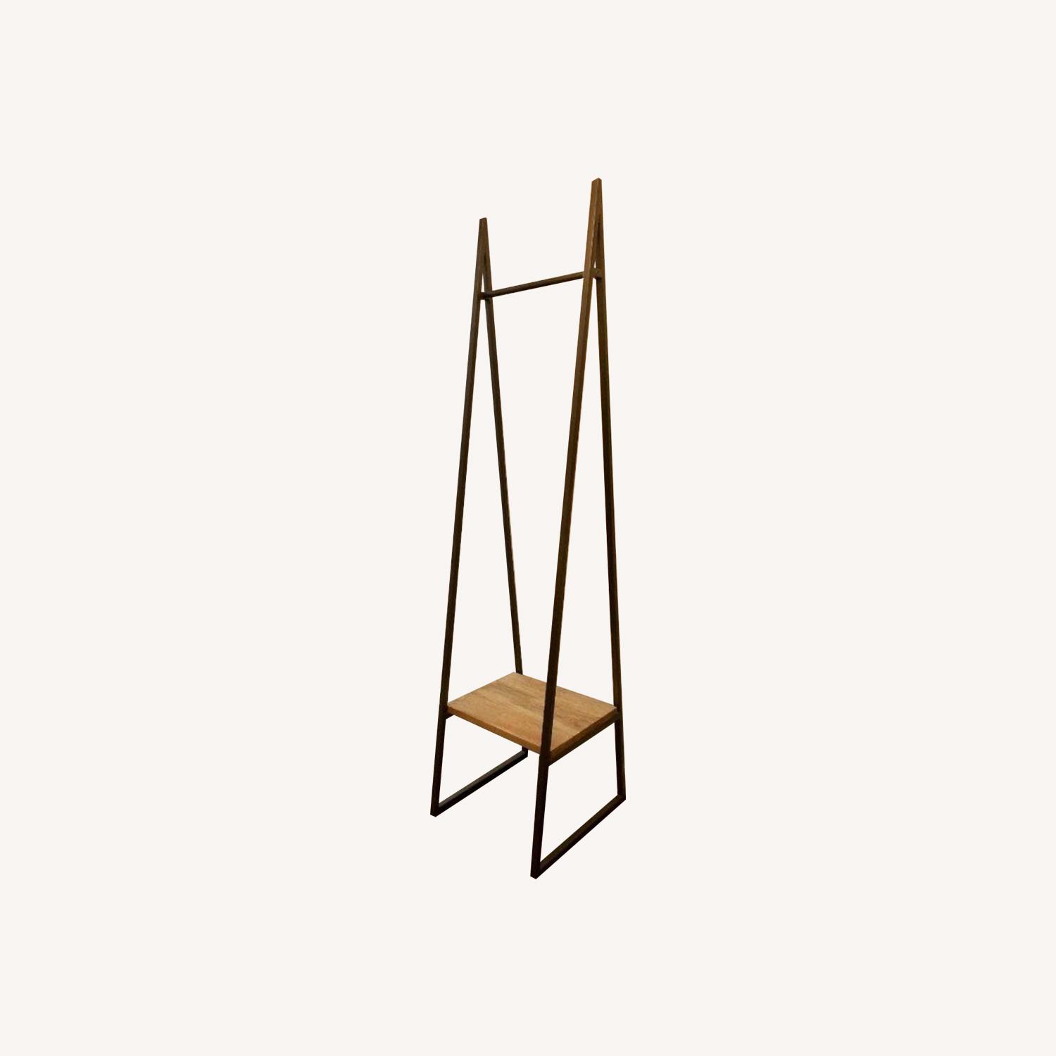 Seller's Notes:coat check. No coat closet? No worry. Our minimalist butler is on duty in a minimum of space. Handcrafted iron frame architects a sleek spot to hang coats with a mango wood shelf below to leverage shoes and bags. • Handcrafted • Iron frame • Mango wood shelf with natural stain • Wipe with soft, dry cloth