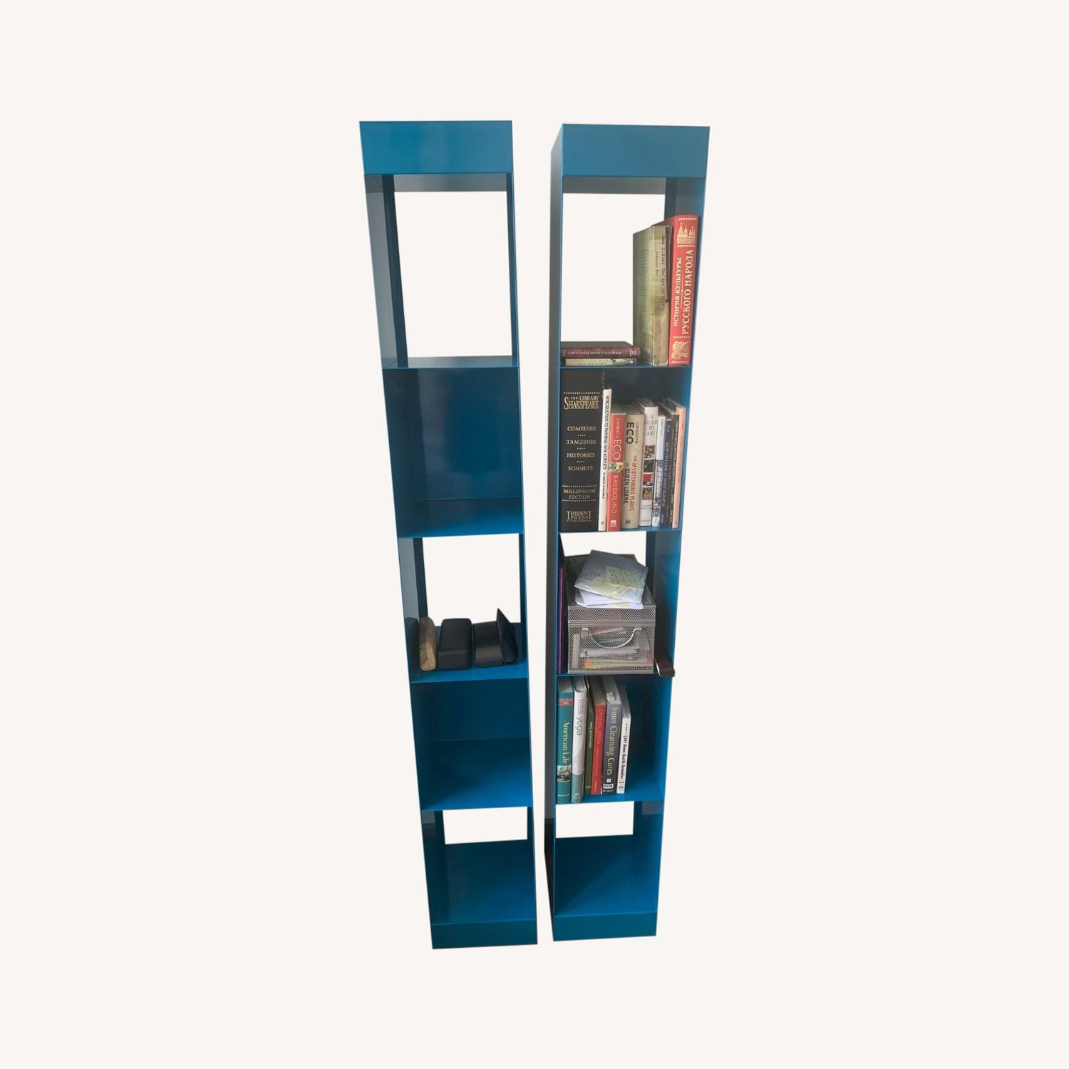 Seller's Notes:Skinny metal storage tower alternates three open/two closed-back cubbies in blue-teal hi-gloss powdercoat. Very modern look & unassuming feel, slides into a corner easily. One of the felt tips fell from the bottom corner, so I just put a piece of cardboard to stabilize or you can just buy the felt circle on amazon. Some scratches on the metal - see pics, but you can just put against the wall to cover (not too visible anyway). Carlson II Blue Tower. Metal with bright blue/teal powdercoat finish Alternating shelves have back panels Levelers and anti-tip hardware included Genuine CB2.