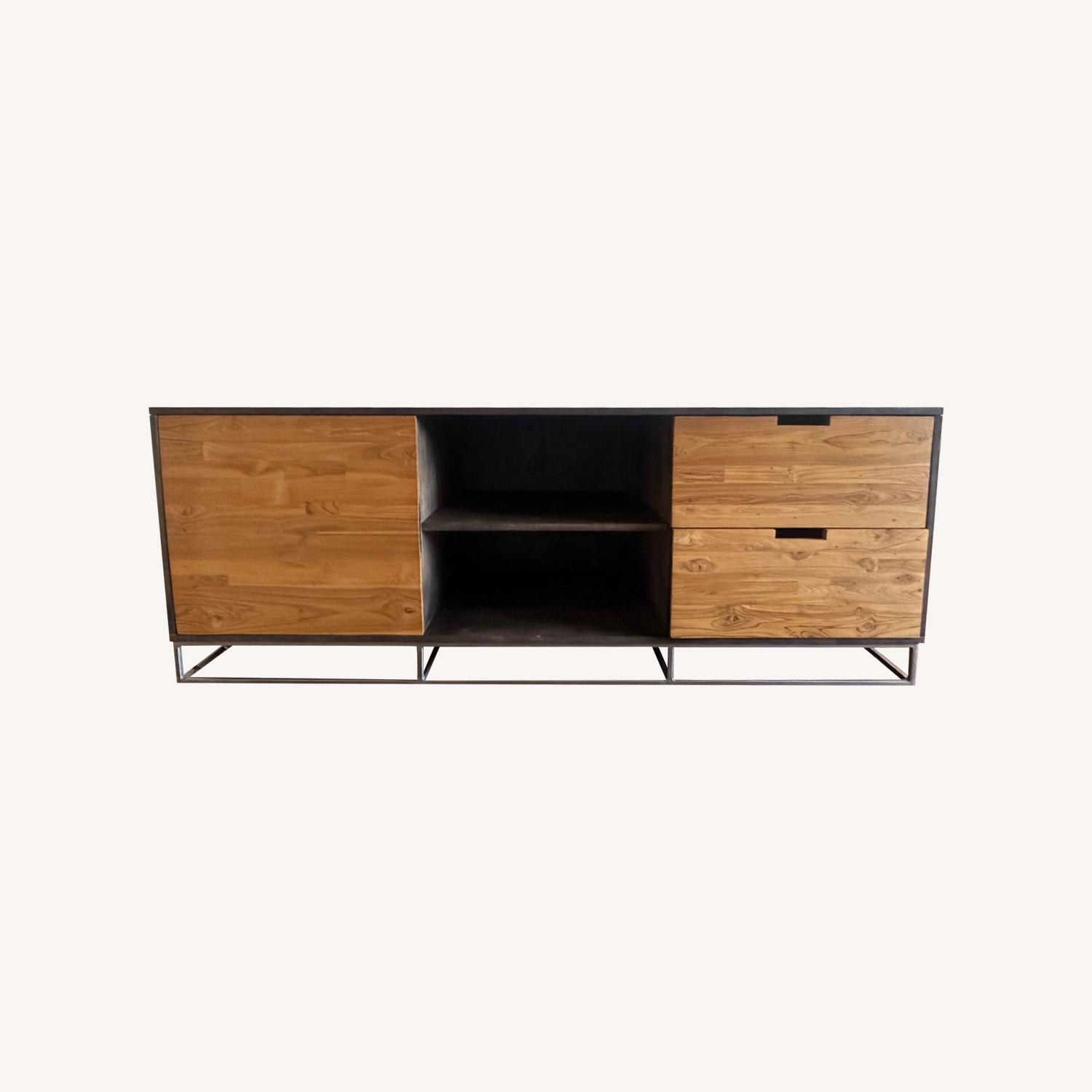 Seller's Notes:Large, wooden media credenza. Only a couple of years old. There is a small dent in the bottom frame that occurred when purchased otherwise, it is in great condition! Has two drawers and a section with two shelves. I love it and am only selling it because I’m moving cross country.