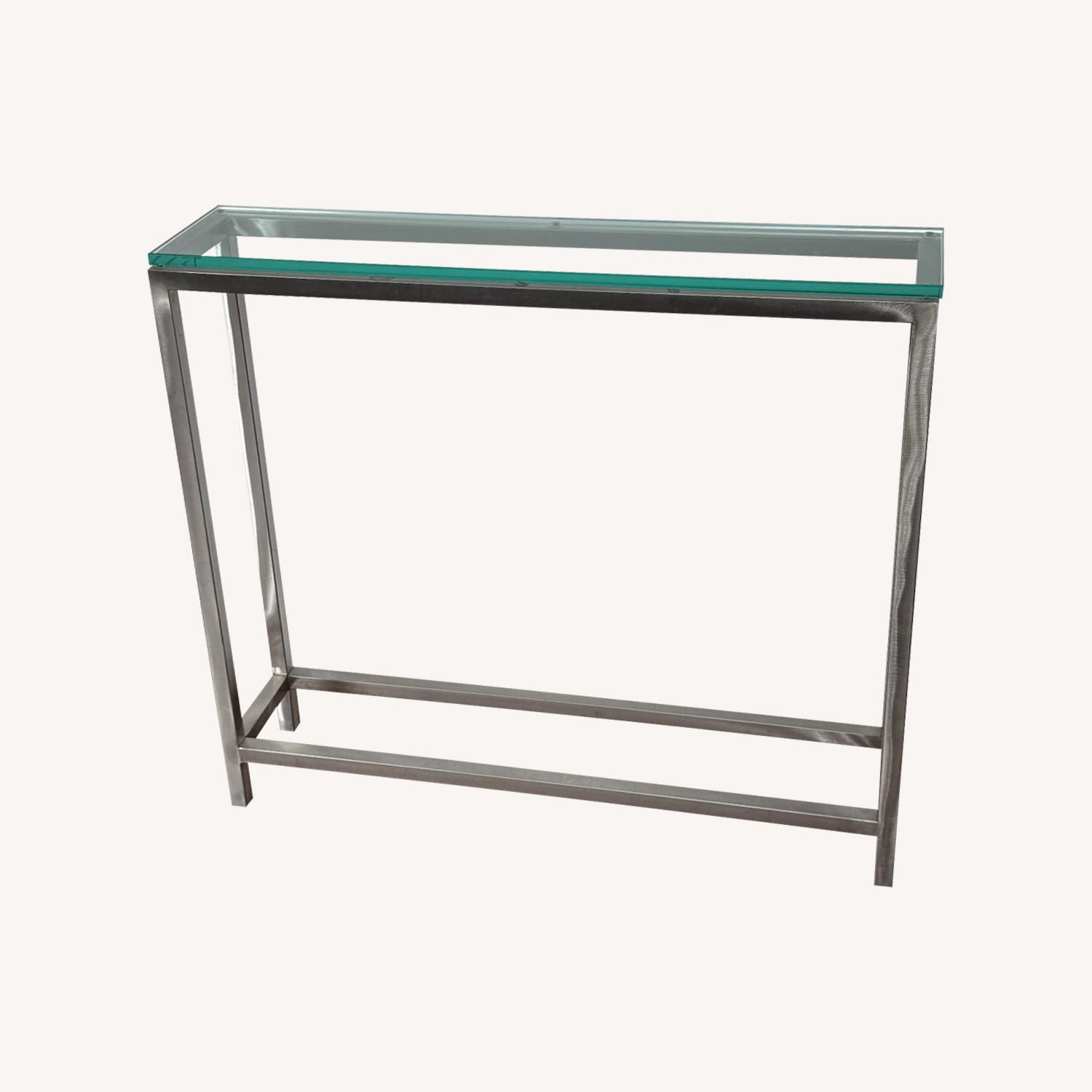 Seller's Notes:CB2 Console Table with 8 MM clear tempered glass top, machine iron tube frame with chrome-plated finish. A few small scratches on the glass that are normal wear and tear.
