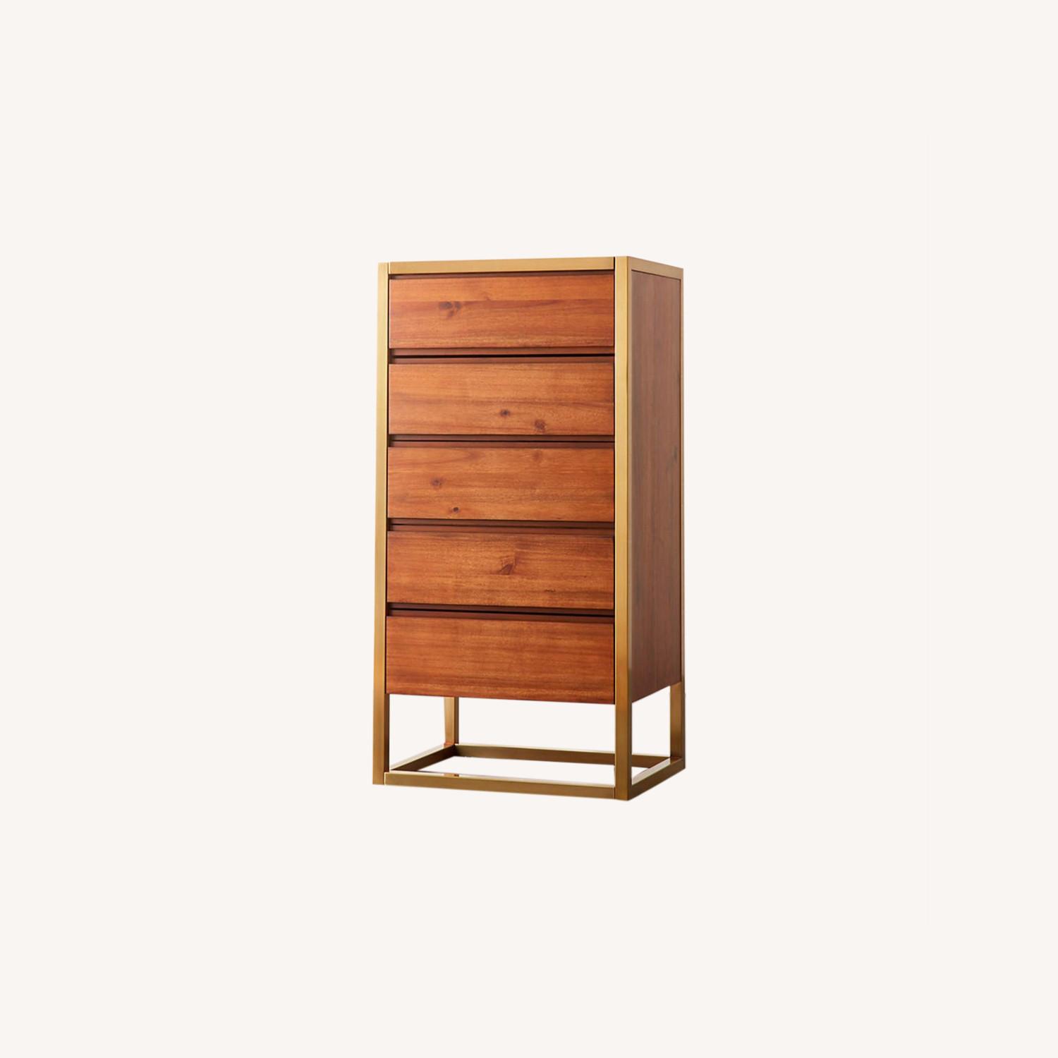 Seller's Notes:Hide and chic. Designed by Mermelada Estudio, the idea was to design a piece with a simple aesthetic hiding a great surprise. Trimmed in iron-plated brass, this acacia cabinet reveals itself one drawer at a time. Flip open the top surface to see your reflection in a mirror. Fold down the top panel to expose multiple trays made for jewelry and other storage. Learn about Mermelada Estudio on our blog. Head to Style Files for a brief history of this hardworking cabinet. Curious Chiffonier. 24"Wx18.25"Dx47.5"H Designed by Mermelada Estudio Acacia wood veneer over engineered wood Iron trim with brushed brass-plated finish Wipe clean Made in Vietnam